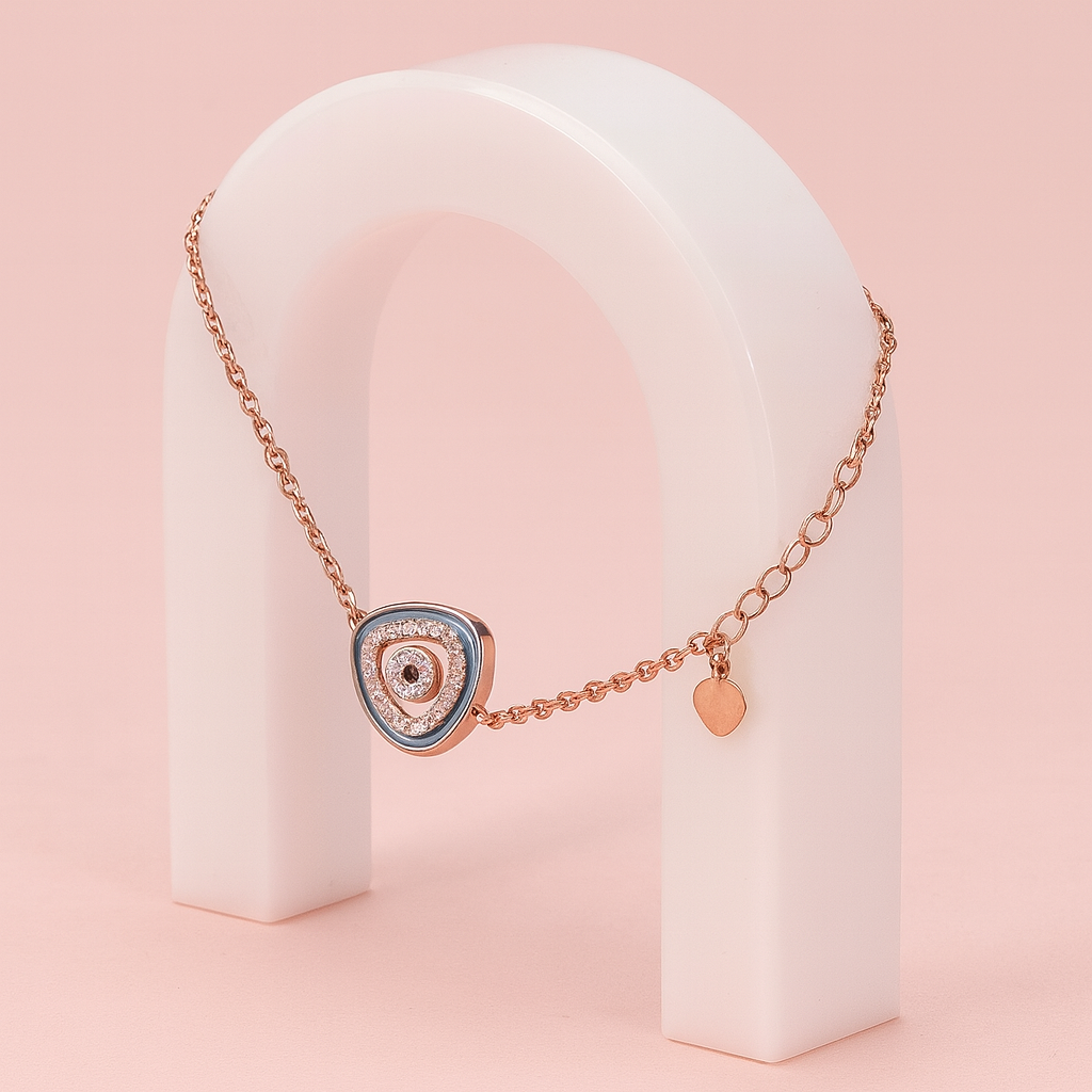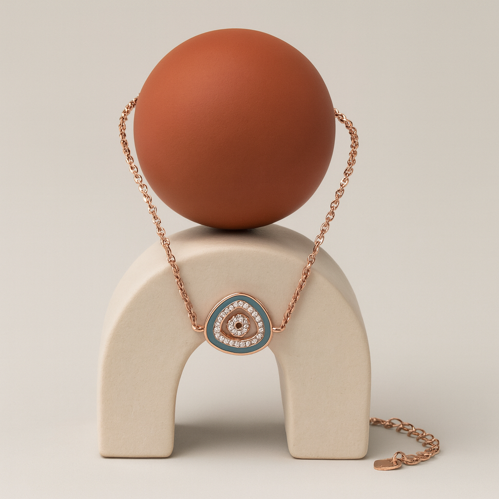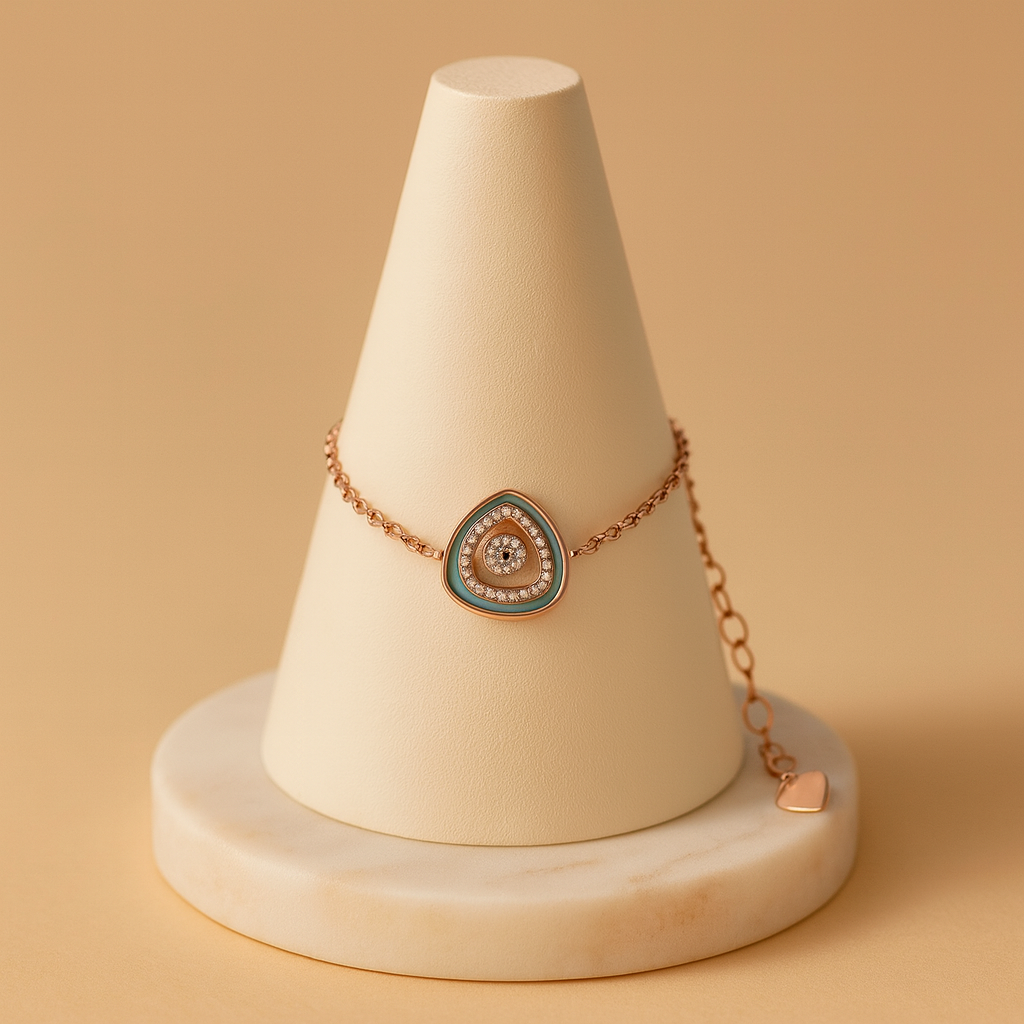 Embrace elegance and protection with the AureaEye Bracelet, a modern twist on the timeless evil eye symbol. Crafted in 925 sterling silver with a rose-gold finish, this bracelet features a unique triangular design highlighted with a soothing turquoise .