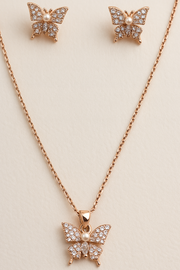 "Elevate your style with the Aurelia Wings Set, a stunning chain and earrings duo in radiant rose-gold plating. Designed with intricately detailed butterfly motifs adorned with shimmering crystals and delicate pearls, this set symbolizes beauty, freedom, and transformation.