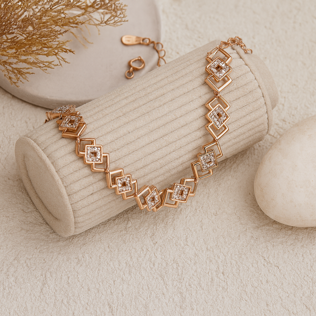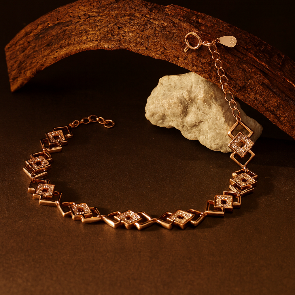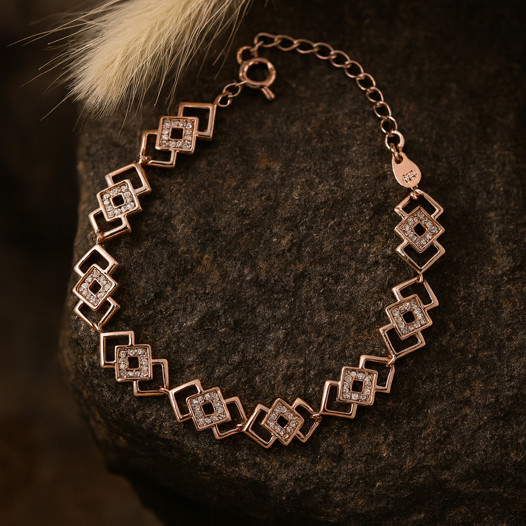 Radiate timeless elegance with the AuroraGleam Rose Gold Bracelet, crafted in premium 925 sterling silver with a luxurious rose-gold finish. Featuring interlinked diamond-shaped motifs adorned with sparkling cubic zirconia.