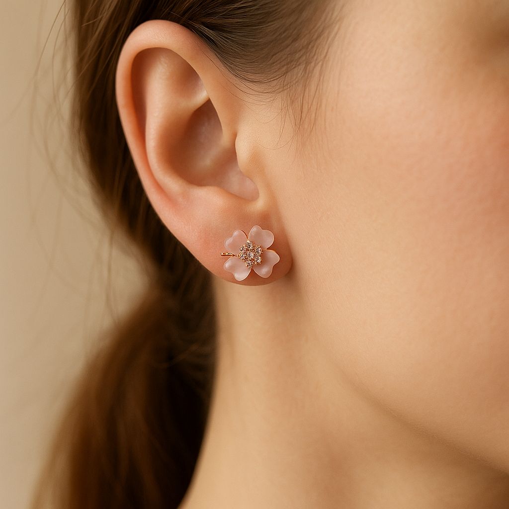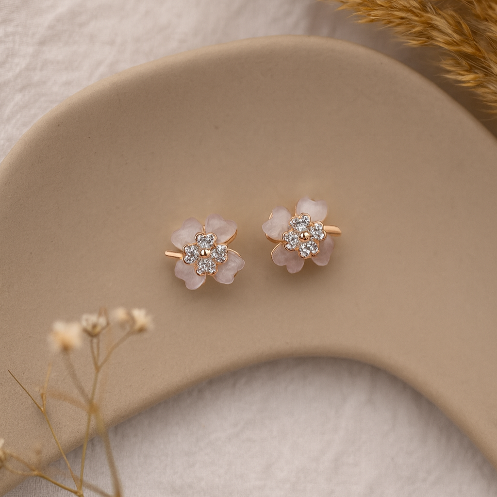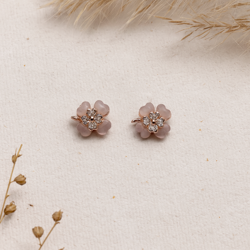 Celebrate elegance with Bloomé Earrings, crafted in rose gold plated 925 sterling silver. Designed as delicate floral studs, each piece features soft blush-toned petals adorned with sparkling cubic zirconia at the center.