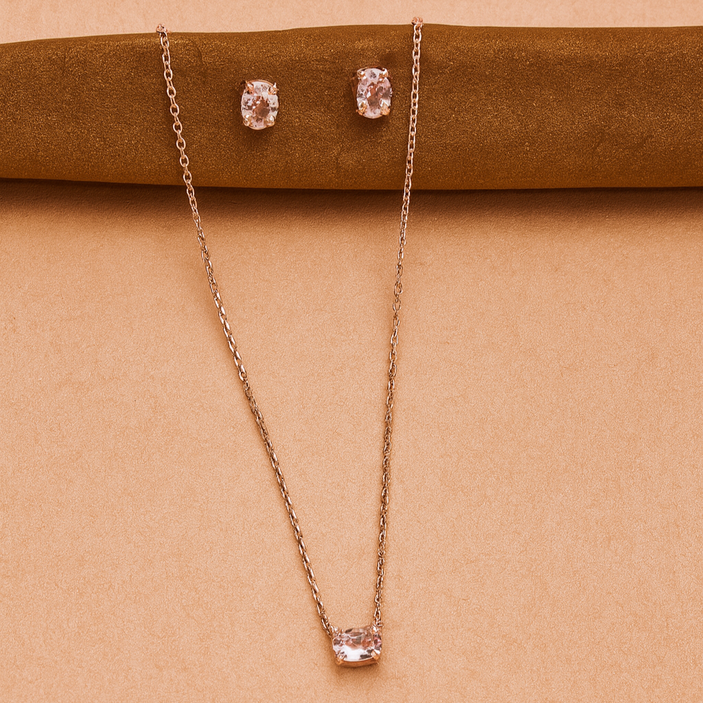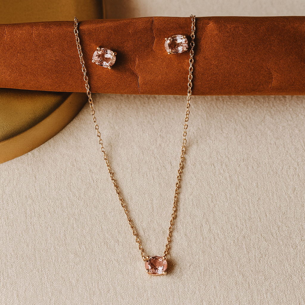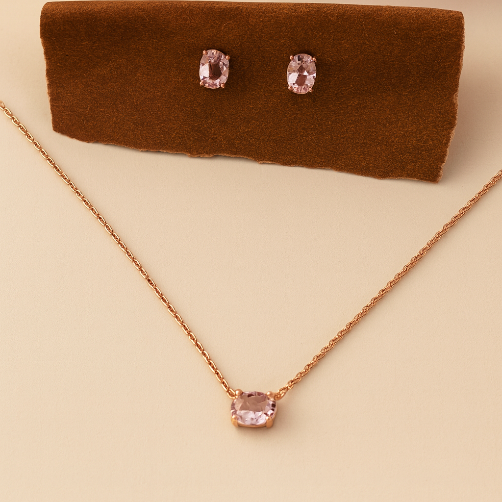 Elevate your style with the BlushAura Set, a graceful combination of a delicate chain and matching stud earrings. Crafted in 925 sterling silver with a luxe rose-gold finish, this set features blush-pink cushion-cut stones that exude timeless elegance.