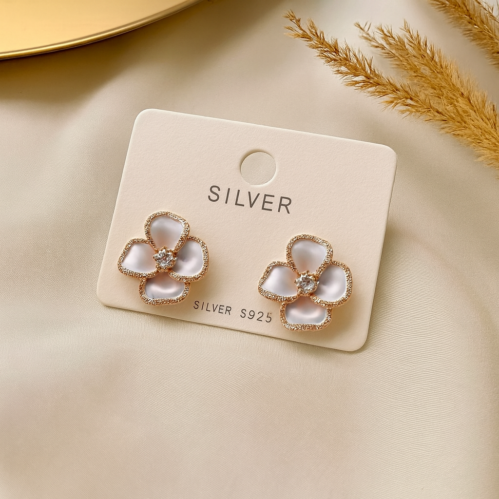 Elevate your style with our BlushBloom Silver 925 Earrings, beautifully crafted in a delicate four-petal floral design. Each petal is outlined with shimmering accents, while a sparkling cubic zirconia stone shines at the center, creating a timeless blend of elegance and charm.