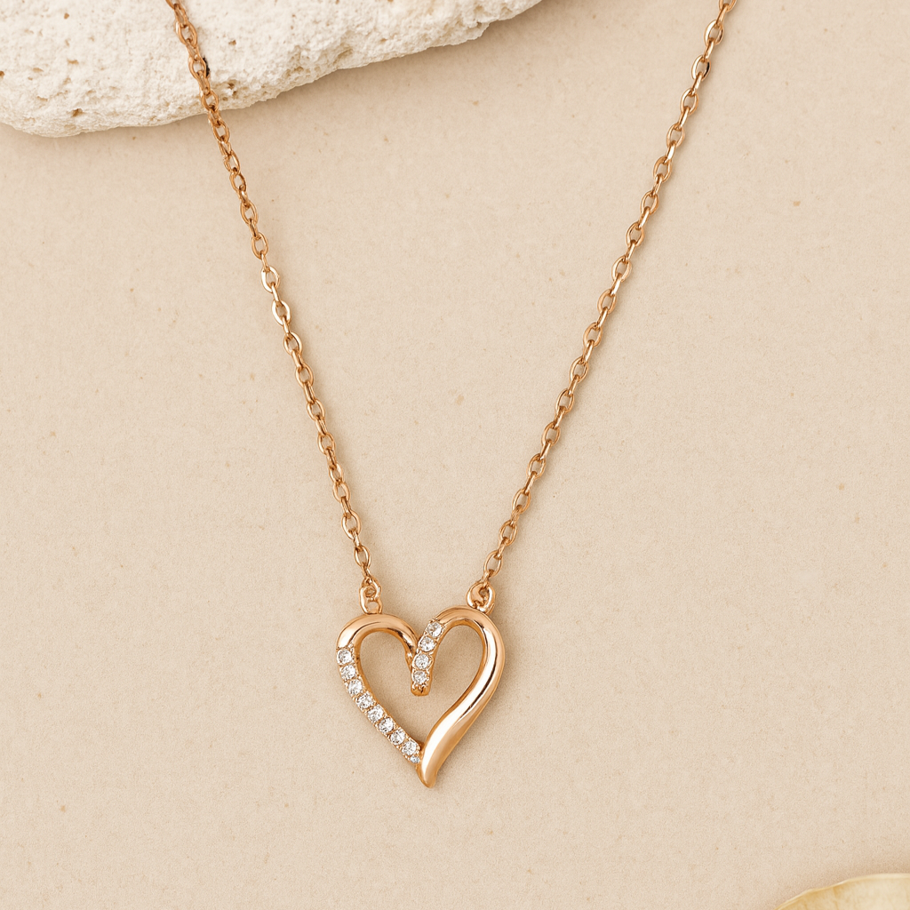 The Charmora Heart Necklace is a delicate symbol of love, elegance, and modern charm. Crafted in 925 sterling silver with a radiant rose-gold finish, this open-heart pendant is adorned with shimmering cubic zirconia that sparkle with every movement.