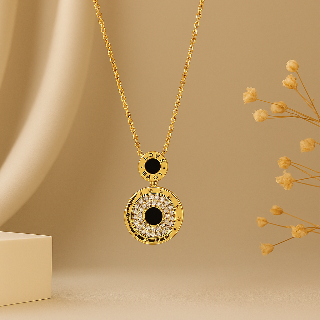 The Circlora Necklace is a bold expression of harmony and elegance. Designed in 925 sterling silver with a luxurious 18k gold-plated finish, this pendant features striking concentric circles, a bold black enamel centerpiece, and sparkling cubic zirconia pavé .