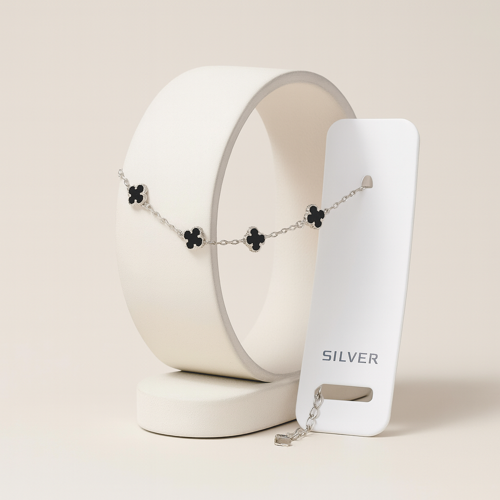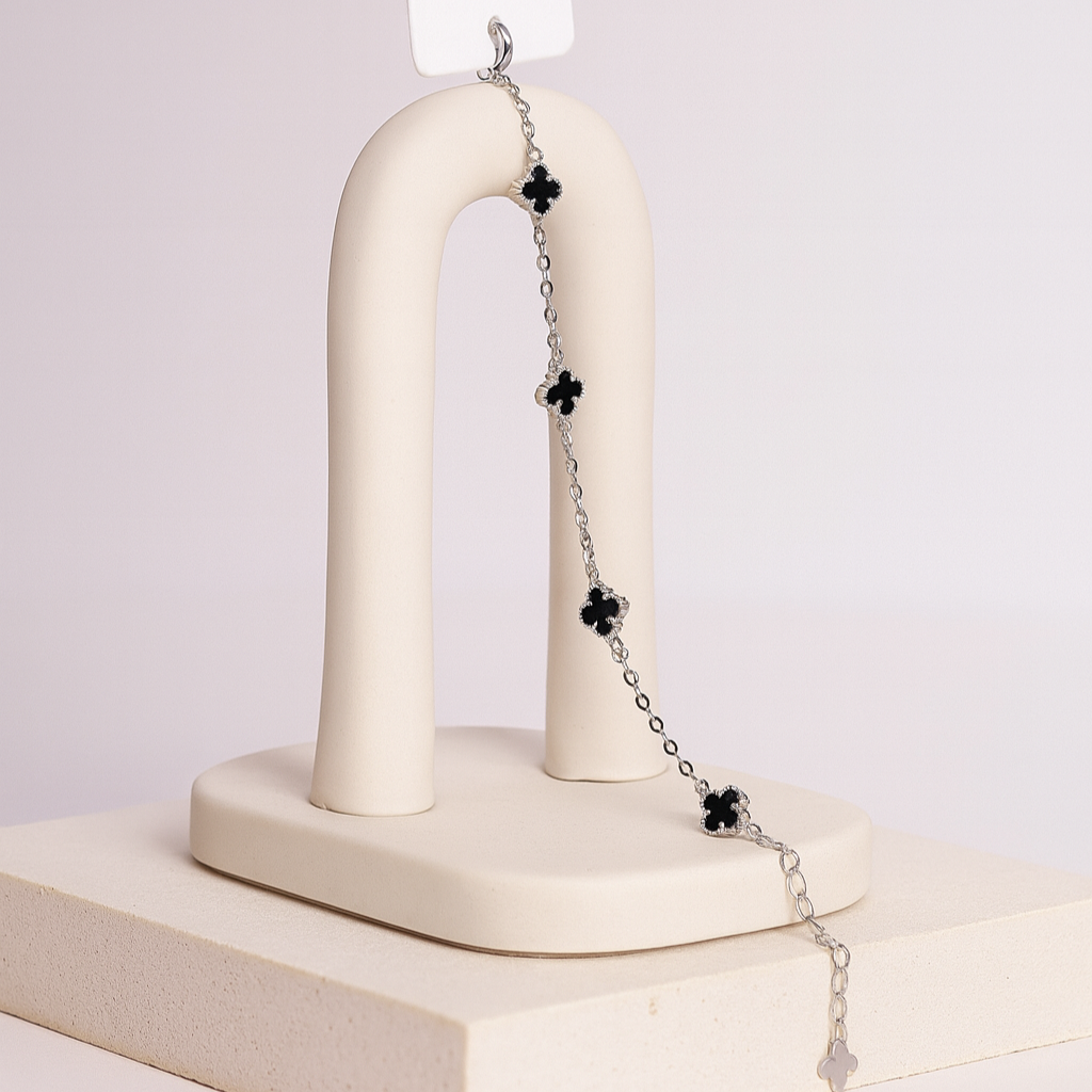 Embrace timeless sophistication with the Eleganz Clover Bracelet. Crafted in genuine 925 sterling silver, this bracelet features elegant black enamel four-leaf clovers, symbolizing luck, beauty, and charm .