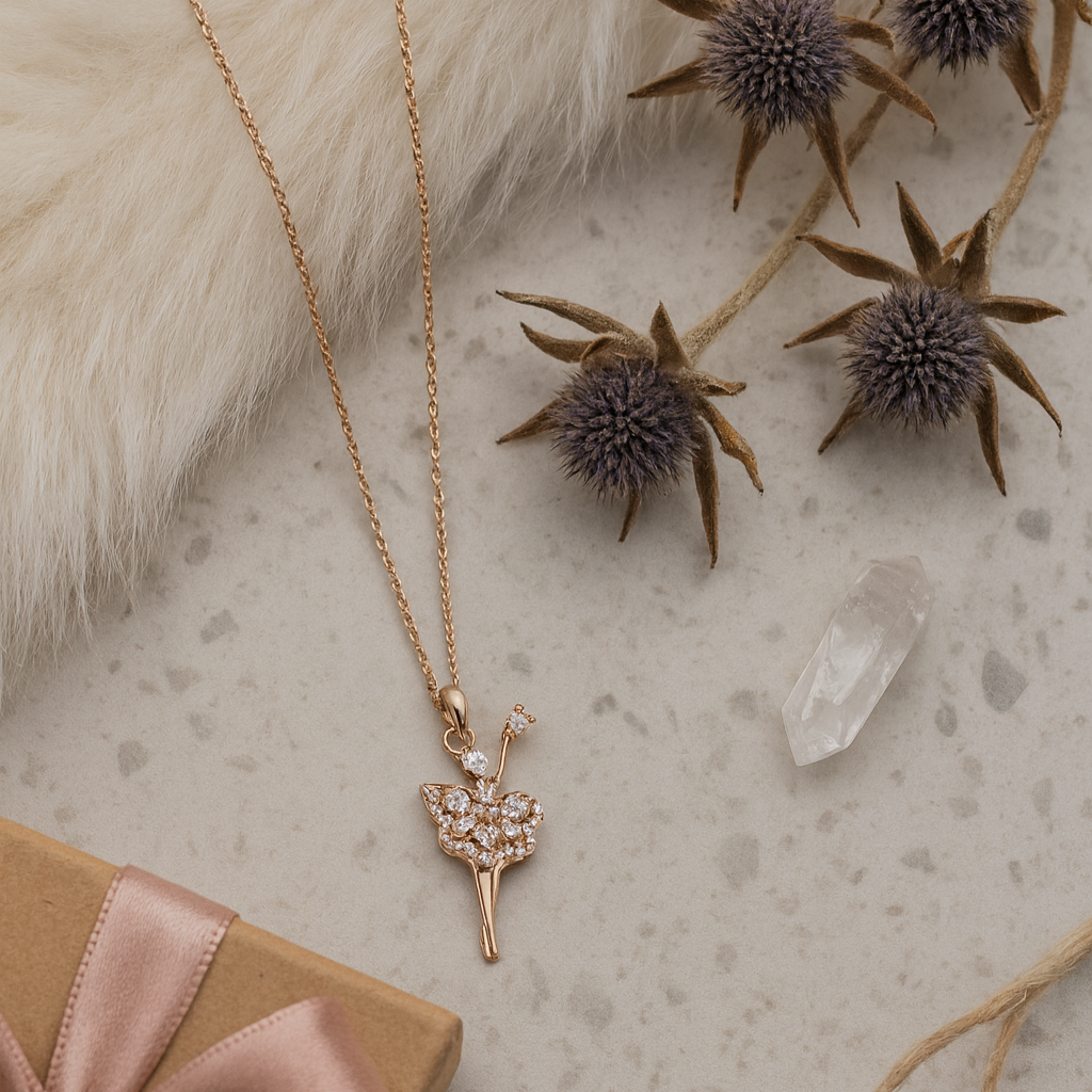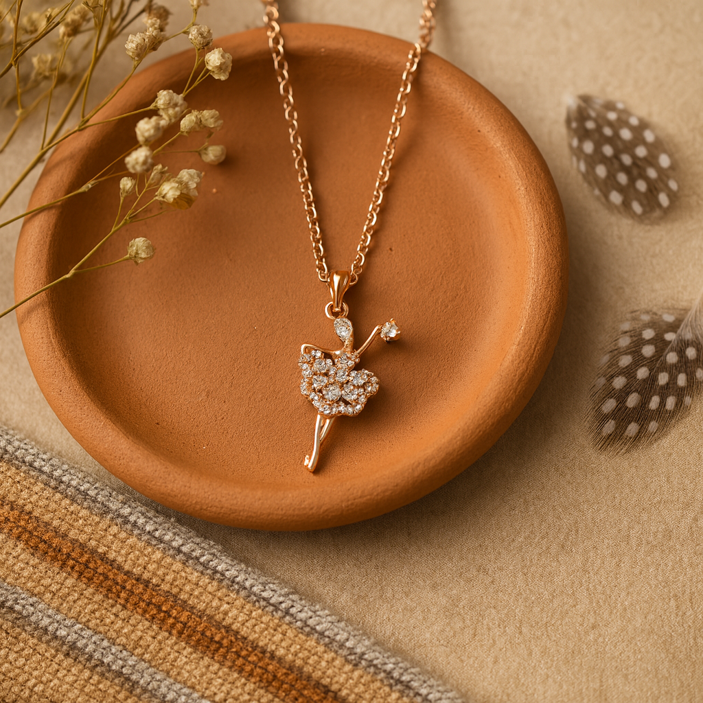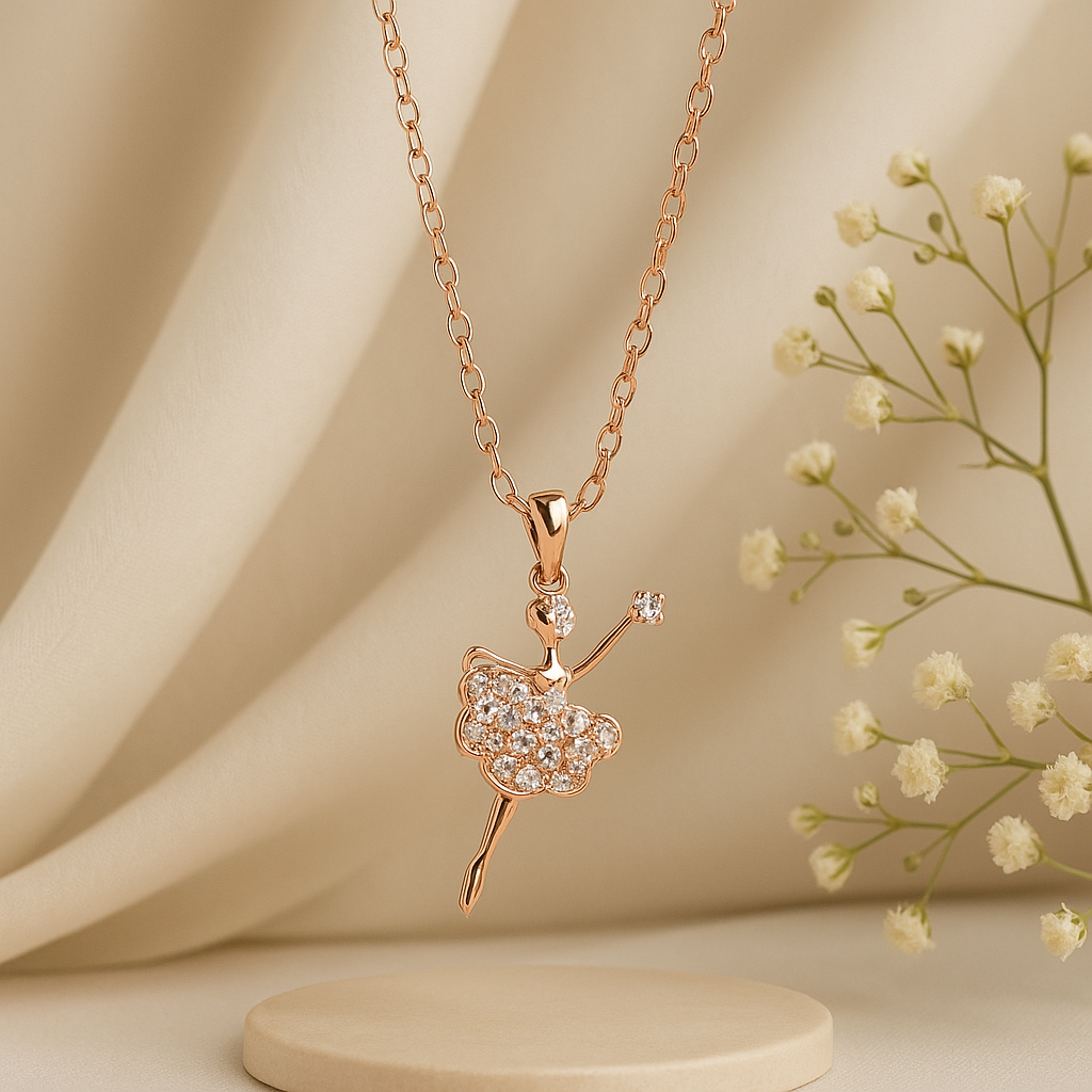 Step into elegance with the Étoile Dancer Necklace, a mesmerizing design in rose-gold plated 925 sterling silver. This enchanting pendant features a ballerina in mid-dance, her dress sparkling with cubic zirconia stones that catch the light with every movement.