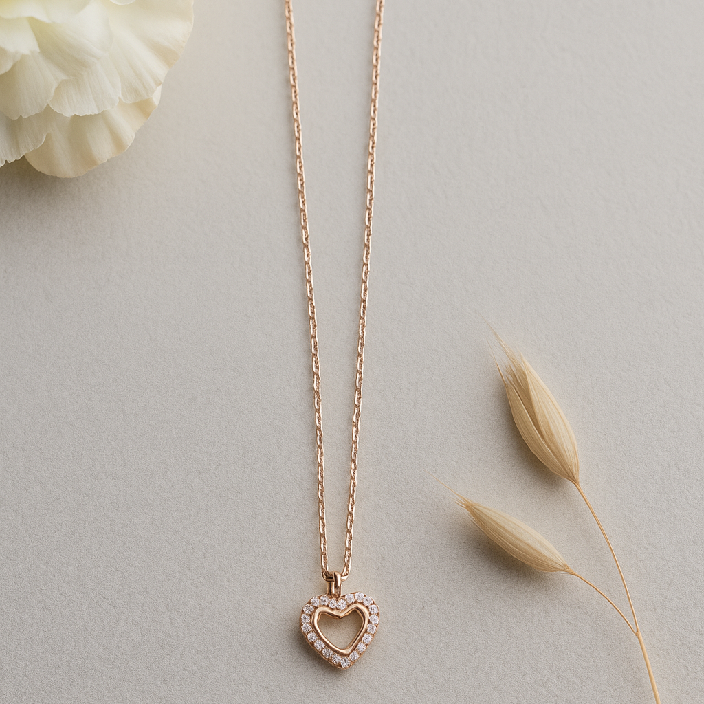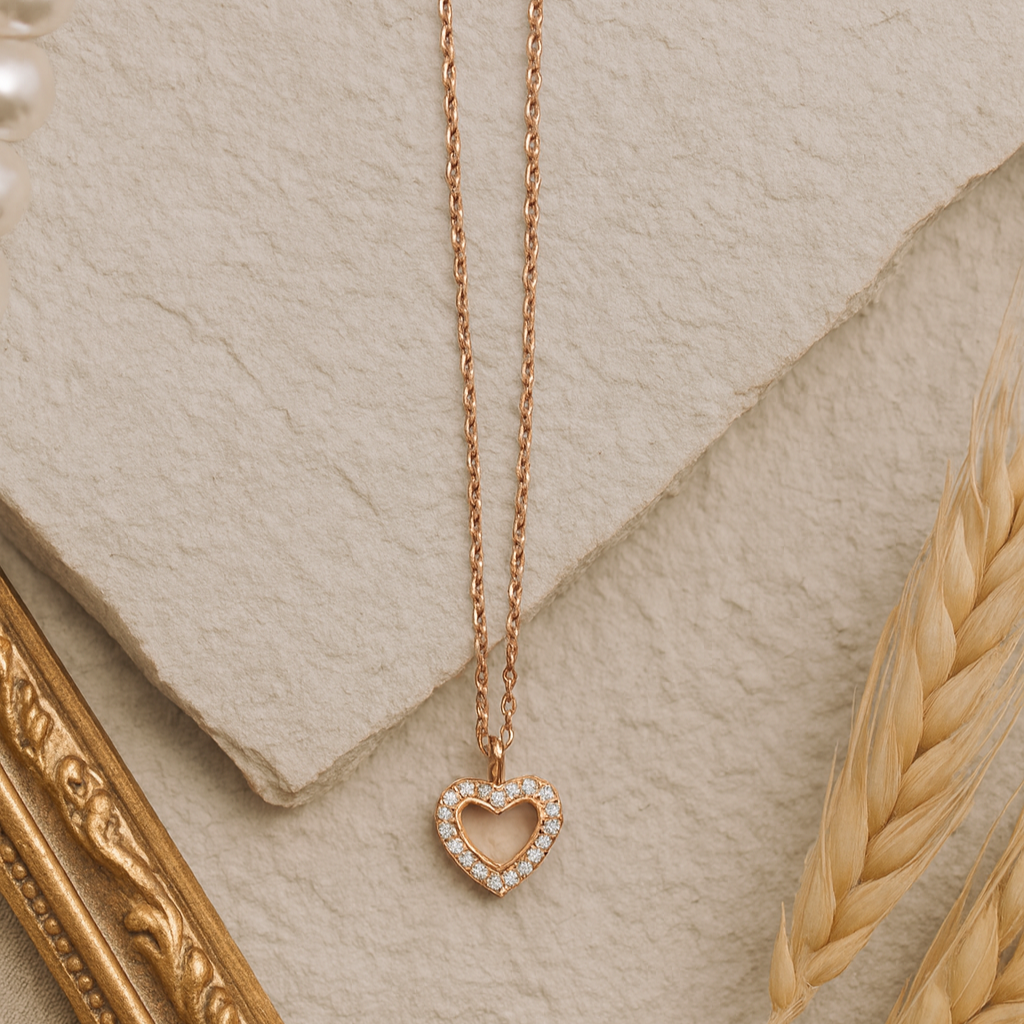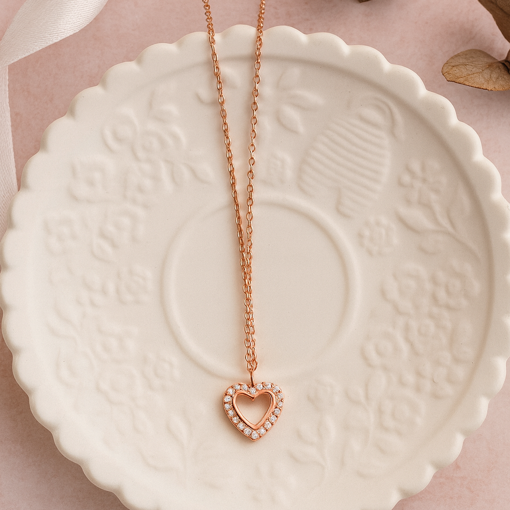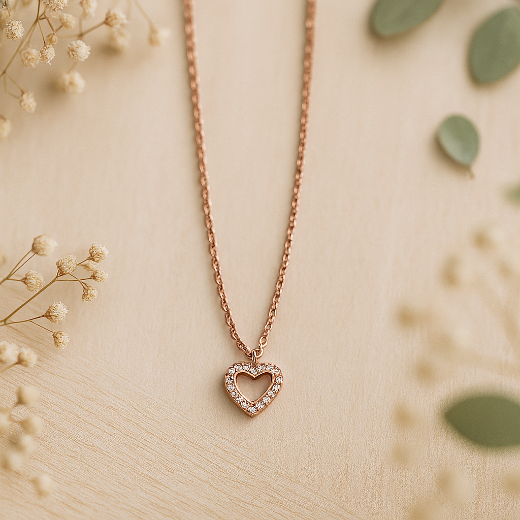 Celebrate love with Fiorra, a dainty rose-gold plated necklace featuring a sparkling heart pendant outlined with shimmering cubic zirconia. Designed for timeless elegance, this delicate chain adds a touch of romance to both everyday looks and special occasions.