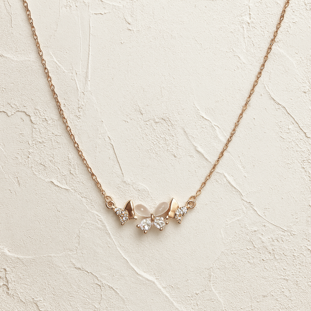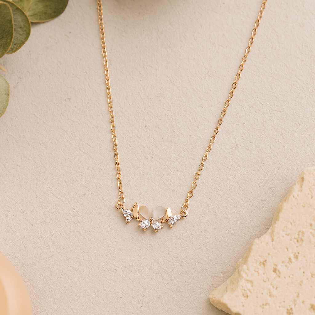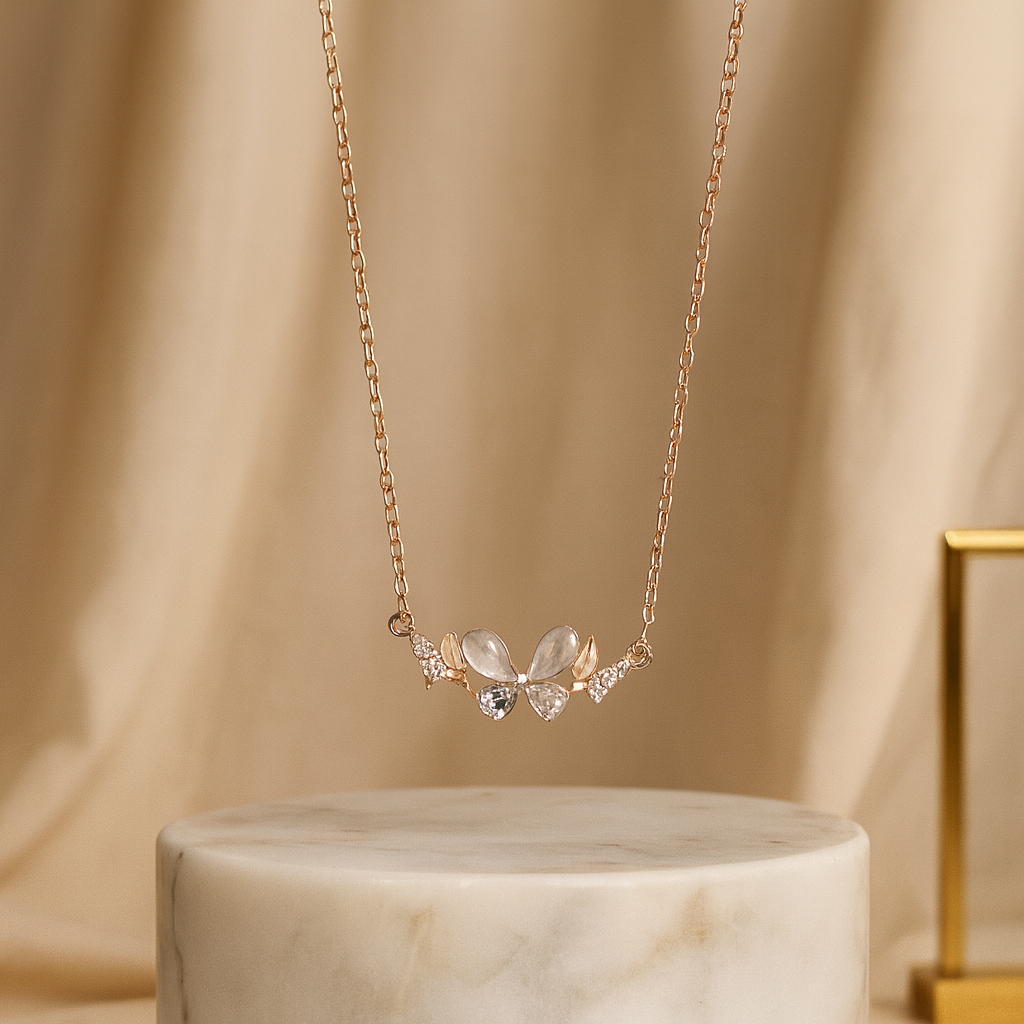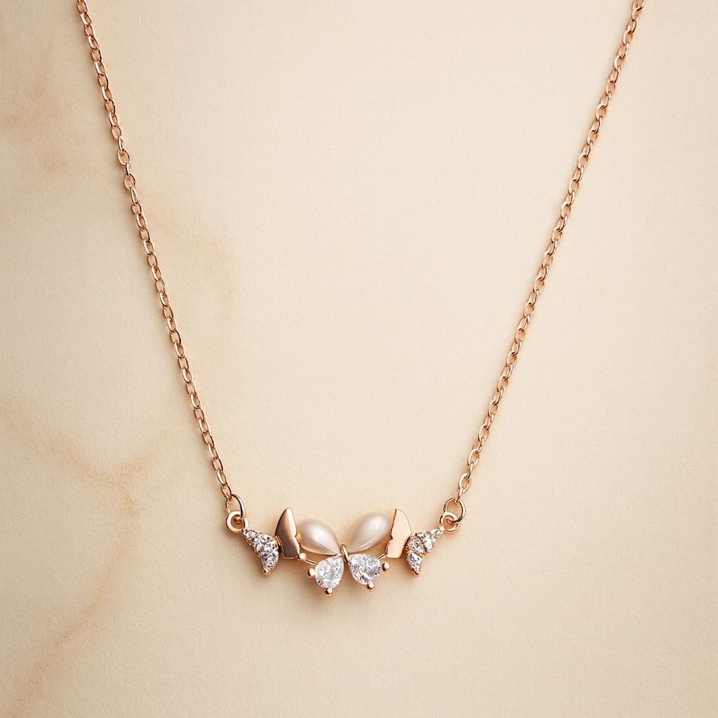 The FleurEssence Necklace is a graceful blend of charm and sophistication, crafted in fine rose-gold plated 925 silver. Designed with delicate petal-like pearls and sparkling cubic zirconia stones, this necklace blooms with elegance, making it a perfect choice for both everyday wear and special occasions