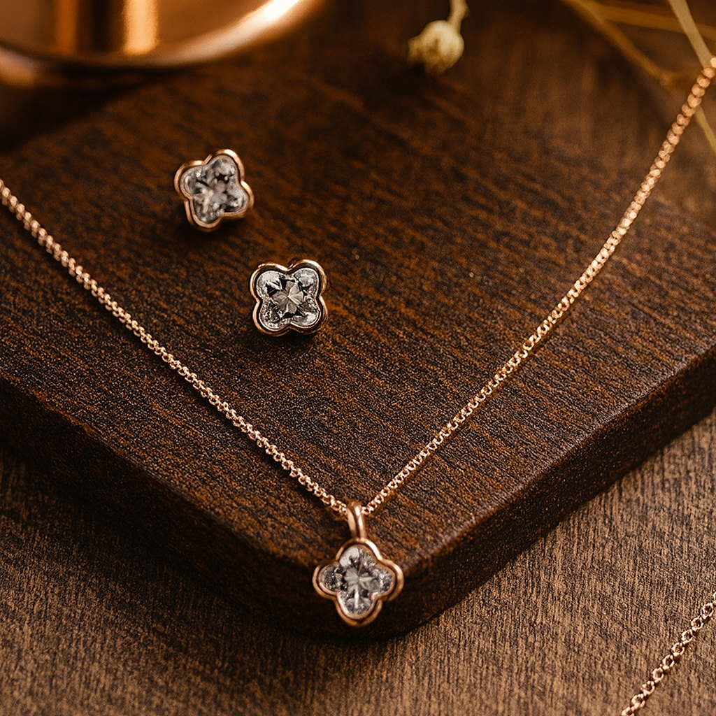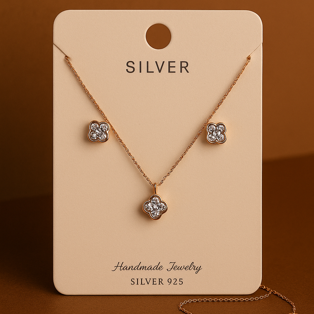 Unveil timeless elegance with the FleurMyst Set, a beautifully crafted 925 Sterling Silver chain and earrings set with a radiant rose-gold finish. Inspired by delicate floral clover motifs, this jewelry set adds a touch of mystery and charm to your look.