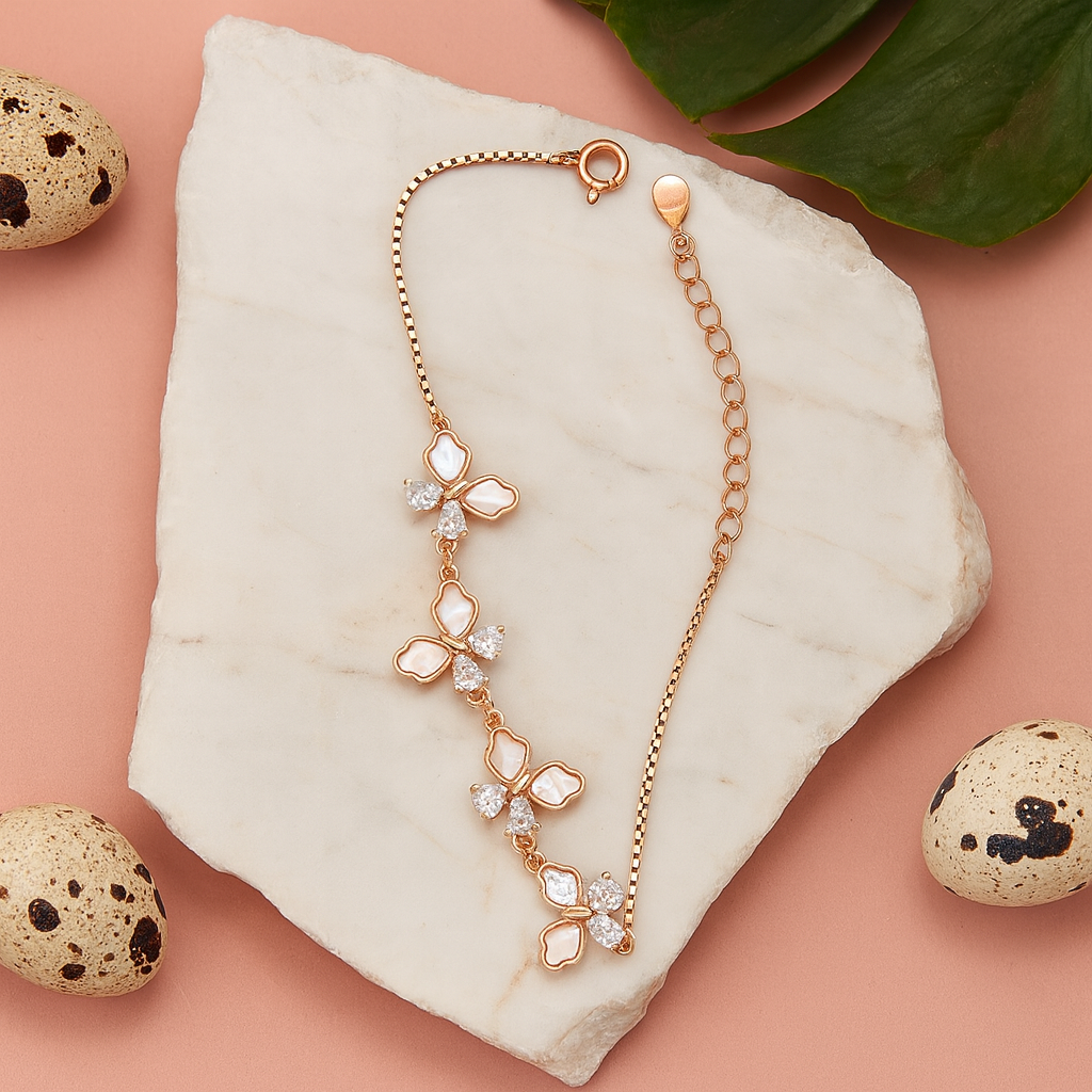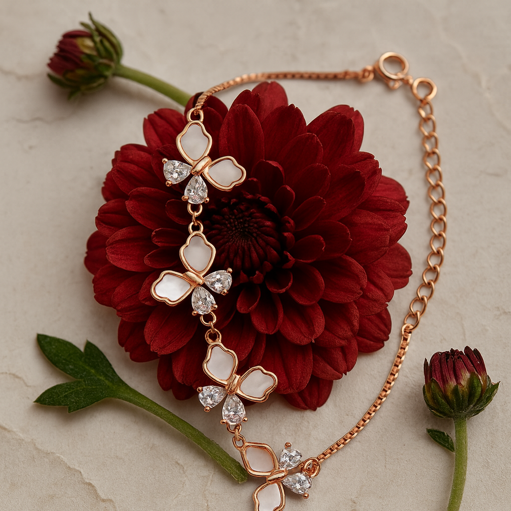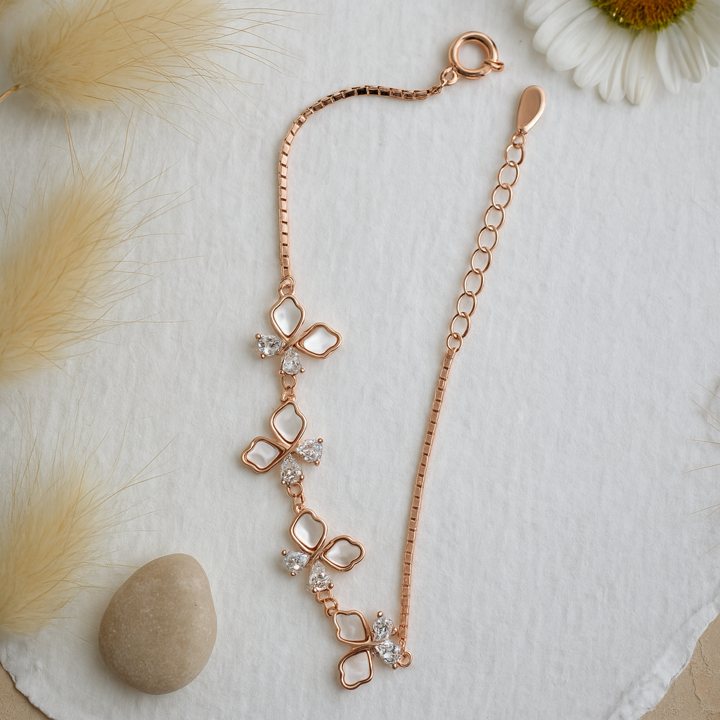 Add a flutter of elegance to your style with the FleurWings Bracelet. Handcrafted in 925 fine silver with a rose-gold finish, this bracelet showcases delicate butterfly-inspired motifs adorned with sparkling cubic zirconia stones.