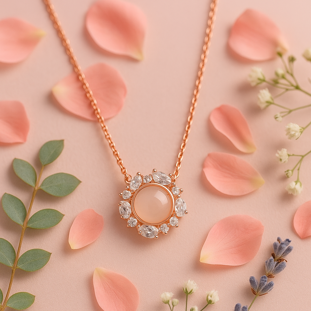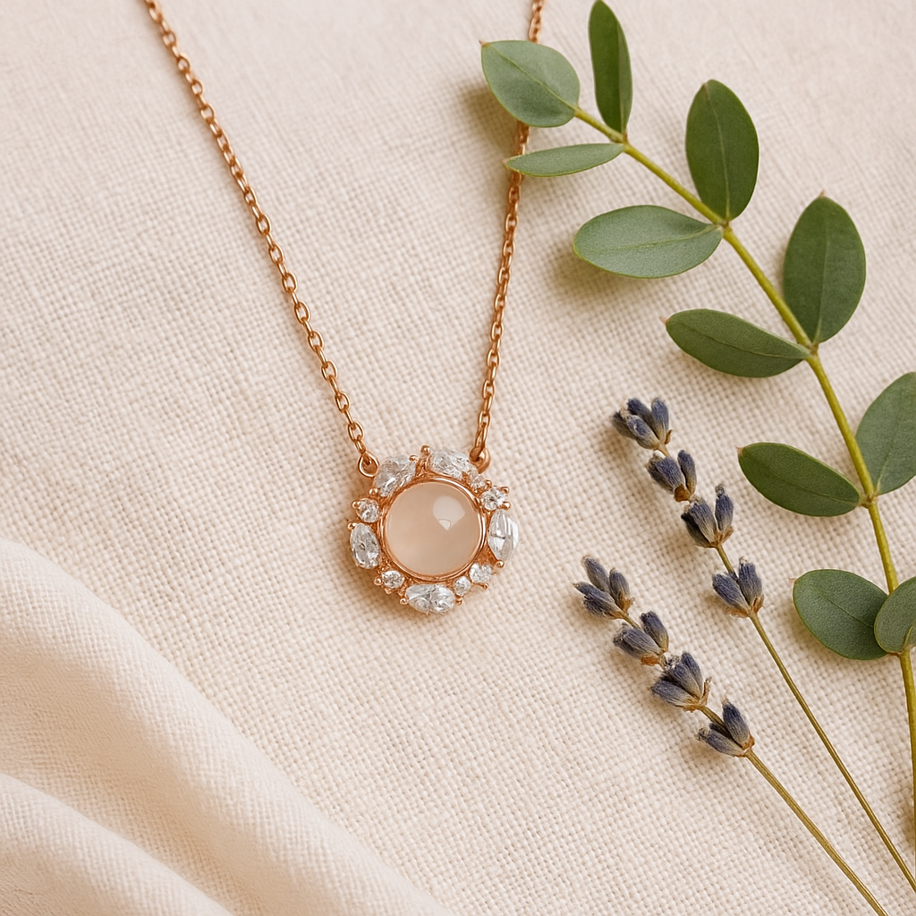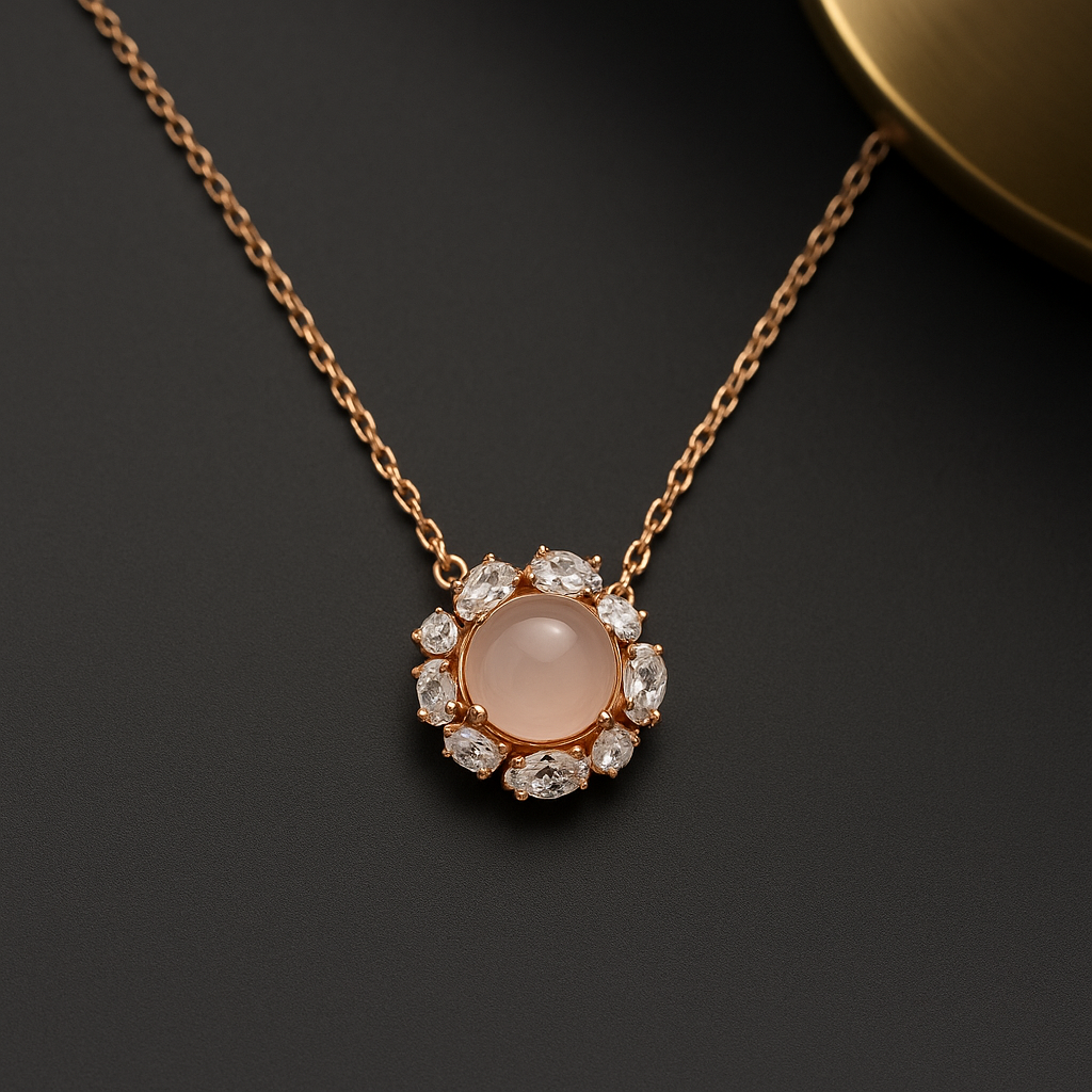 The Lunessence Necklace is a radiant symbol of grace and timeless beauty. Crafted in 925 sterling silver with a rich rose-gold finish, this pendant features a luminous cabochon-style center stone surrounded by a sparkling halo of cubic zirconia, resembling petals in bloom.