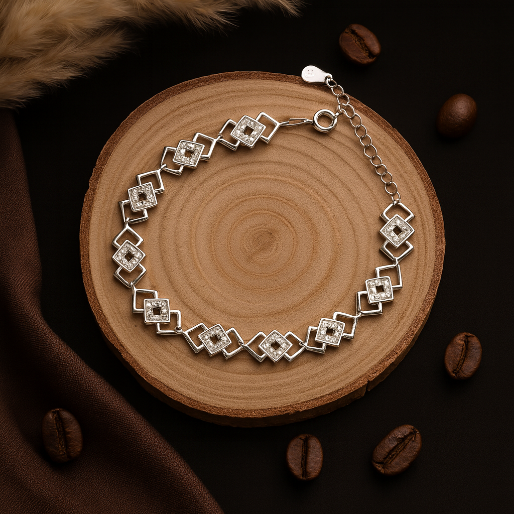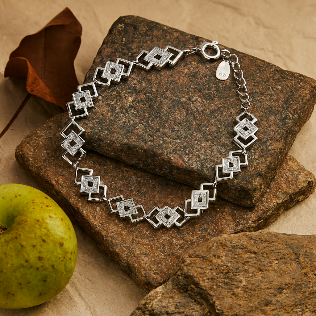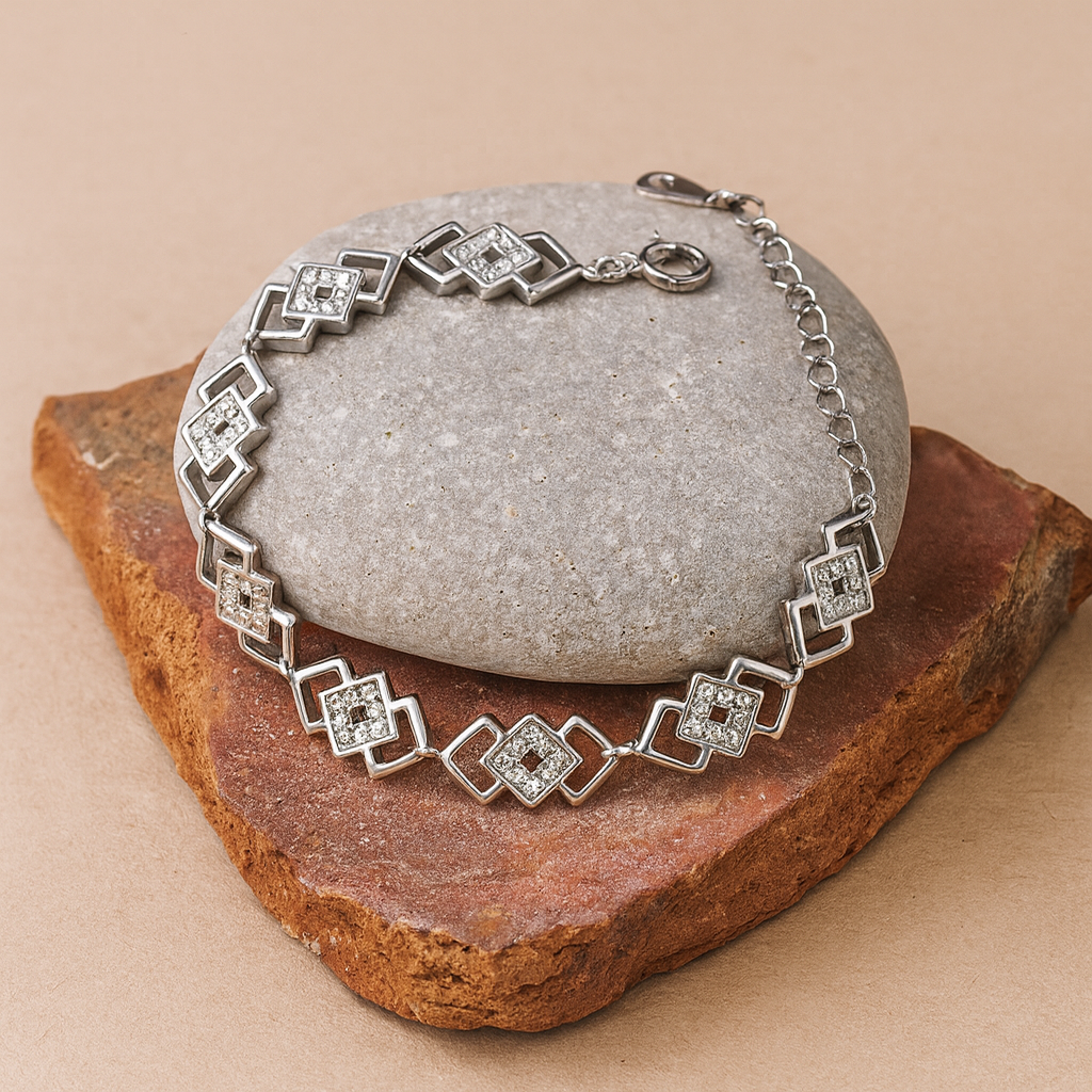 Elevate your elegance with the GeoLustre Silver Bracelet, crafted in pure 925 sterling silver. Designed with interlocking diamond-shaped links, each piece is accented with delicate cubic zirconia for a radiant sparkle.