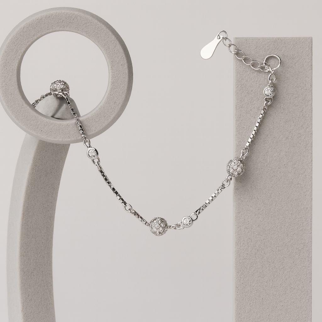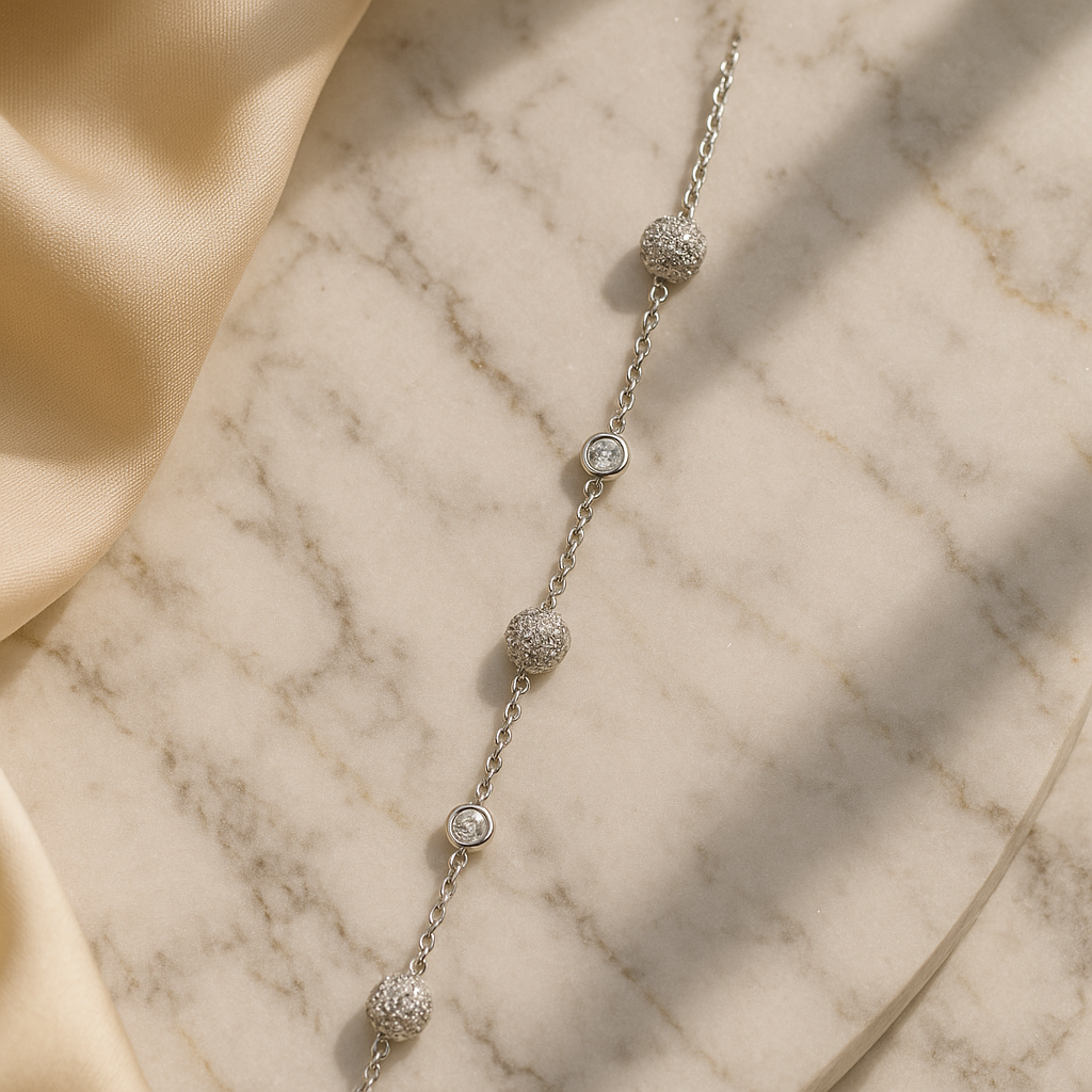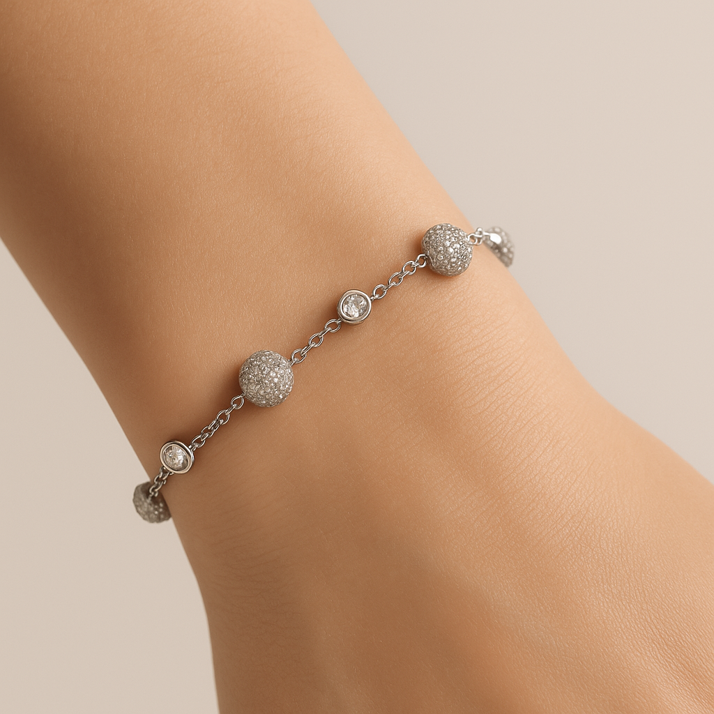 Discover timeless elegance with the Glacé Orbs Bracelet, crafted in premium 925 sterling silver. This delicate chain bracelet features shimmering pavé-set spheres paired with sparkling cubic zirconia, offering a perfect balance of minimalism and luxury.