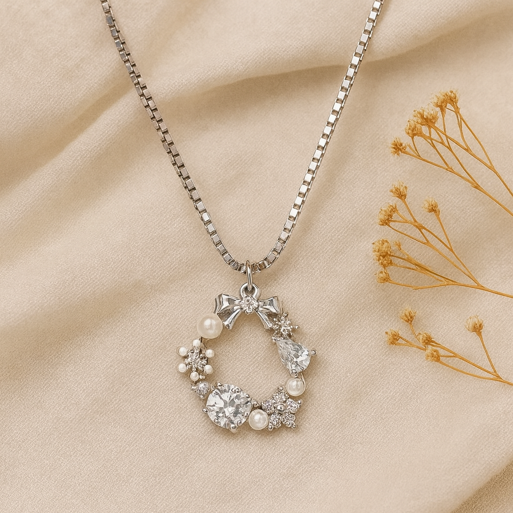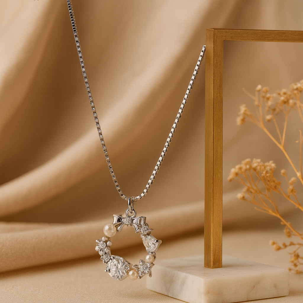 Shine with eternal grace in the Glittera Halo Necklace, a dazzling creation in fine 925 sterling silver. Designed with a radiant halo of shimmering crystals, lustrous pearls, and crowned with a delicate bow, this pendant embodies romance and sophistication.