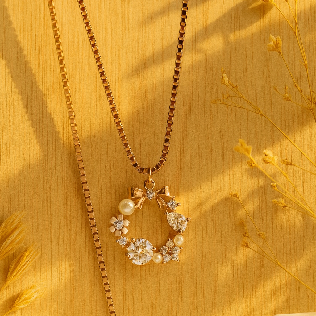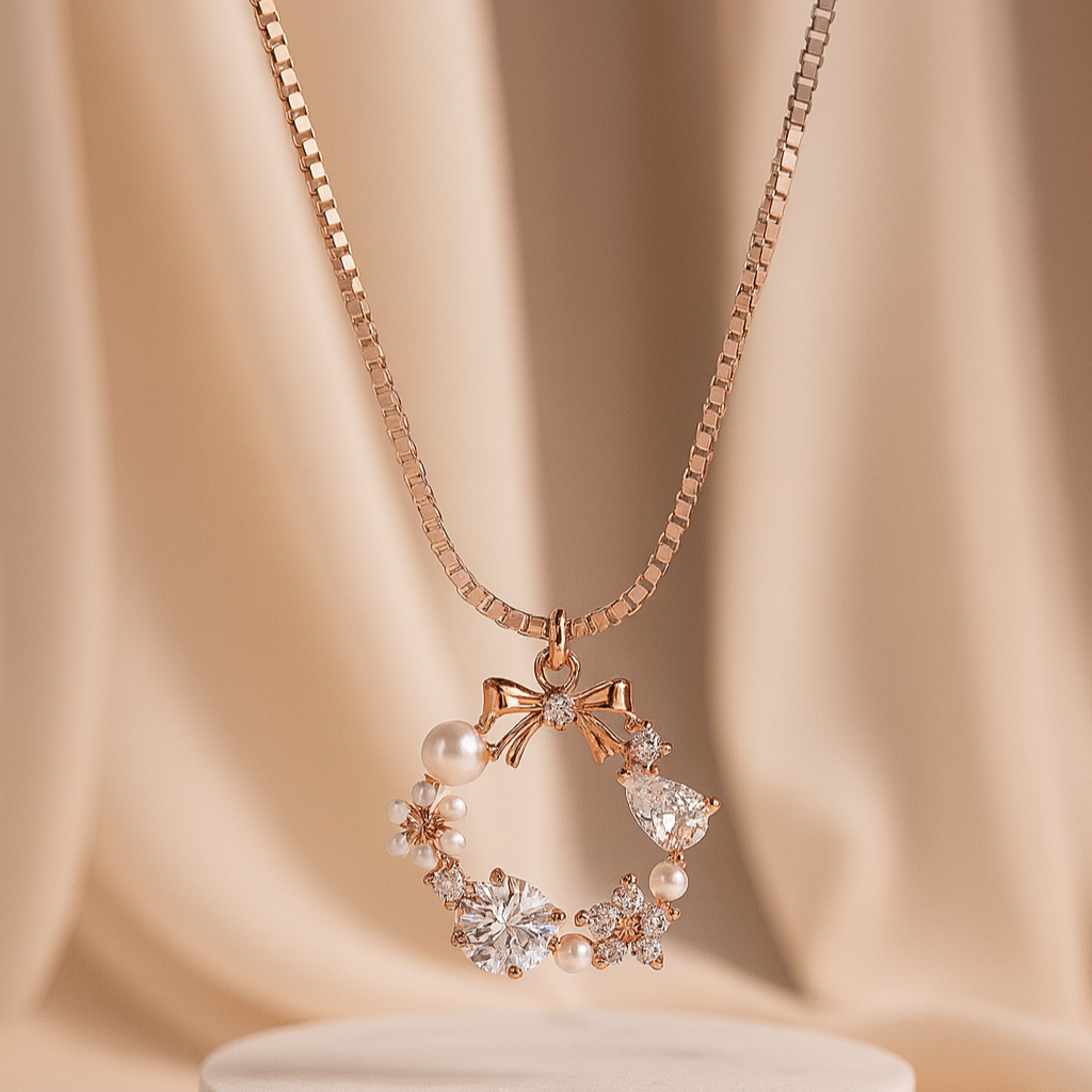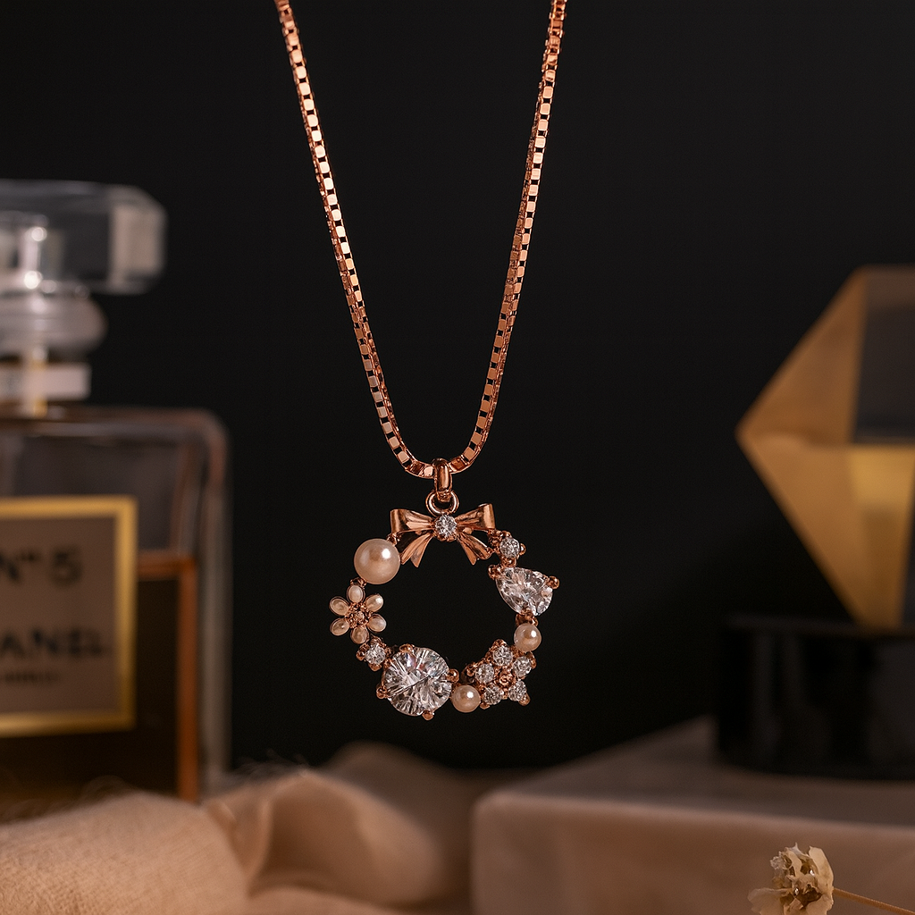 Radiate timeless charm with the Glittera Halo Necklace, crafted in rose-gold plated 925 Sterling Silver. This exquisite pendant features a delicate halo design, adorned with shimmering cubic zirconia stones, lustrous pearls, and a graceful bow accent.