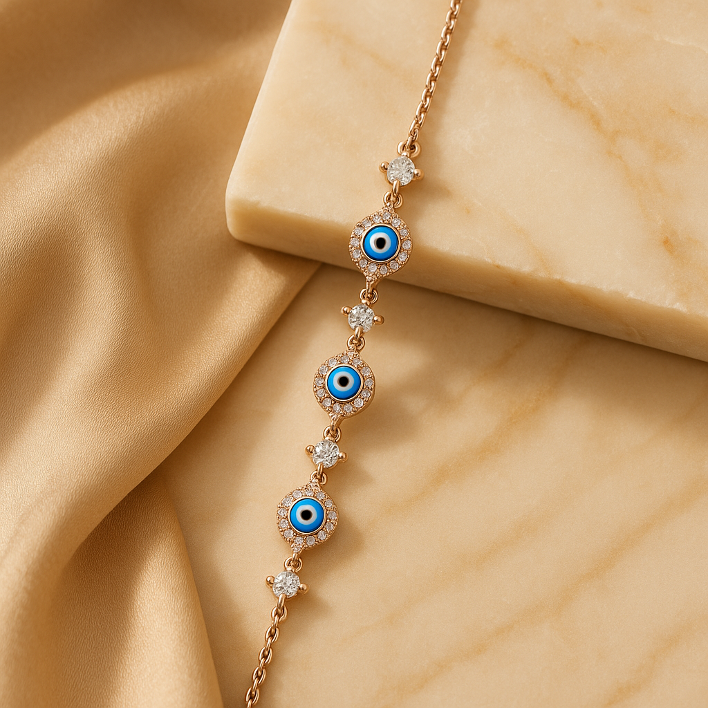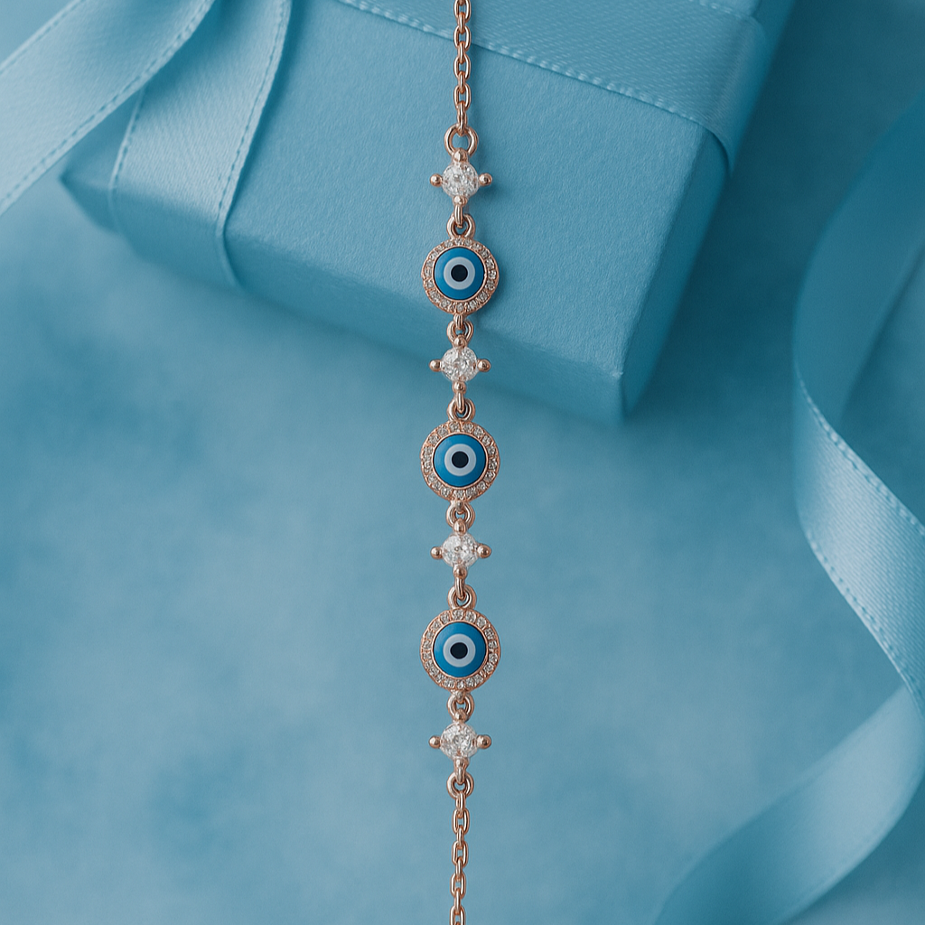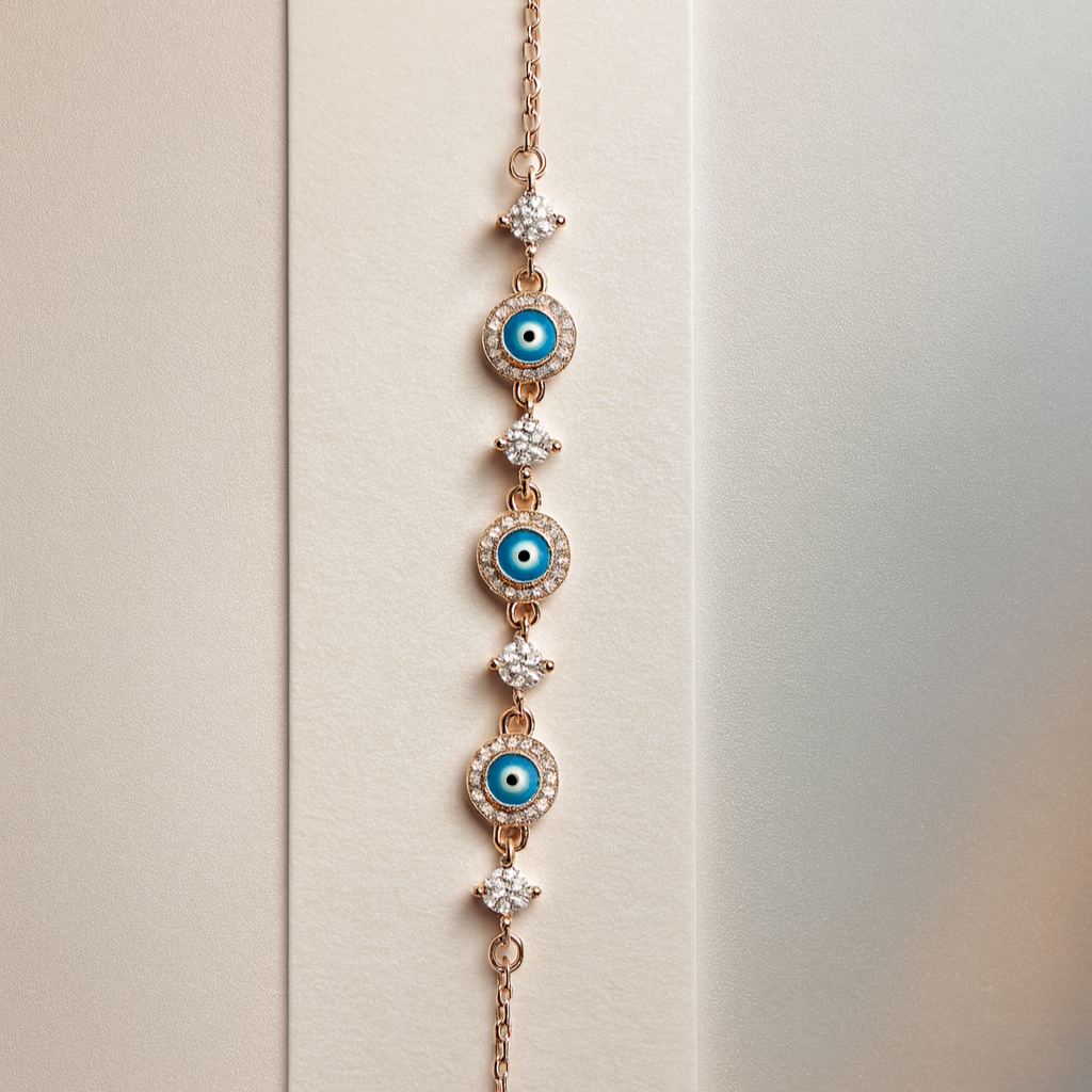Add a radiant touch of protection to your everyday style with the LumeEye Evil Eye Bracelet. Handcrafted in fine 925 sterling silver with a luminous rose-gold finish, this bracelet features striking blue evil eye charms encircled by shimmering cubic zirconia stones.