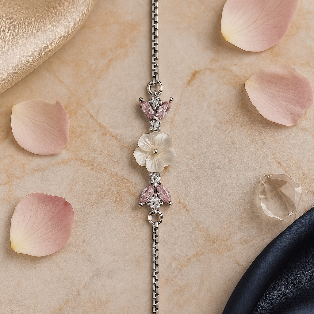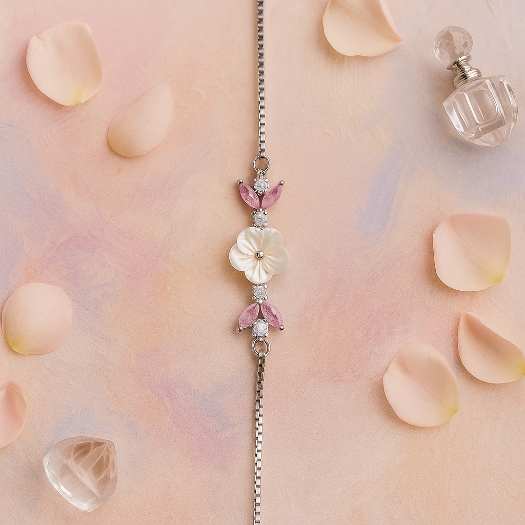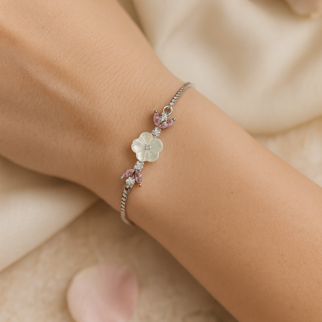 Discover timeless elegance with the LushIvory Bracelet, crafted in fine 925 sterling silver. This delicate piece features a hand-carved ivory flower centerpiece, accentuated with sparkling cubic zirconia and blush-pink marquise stones that resemble soft petals.