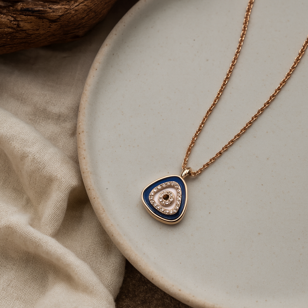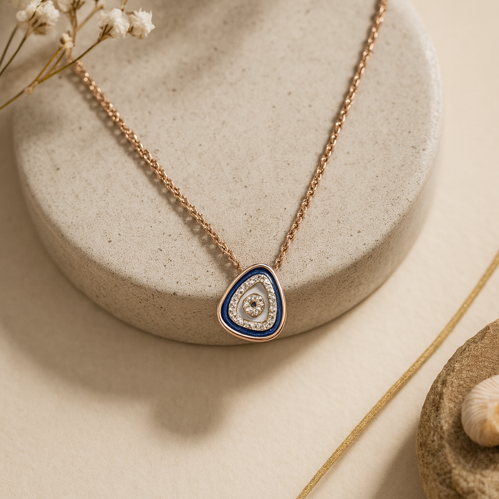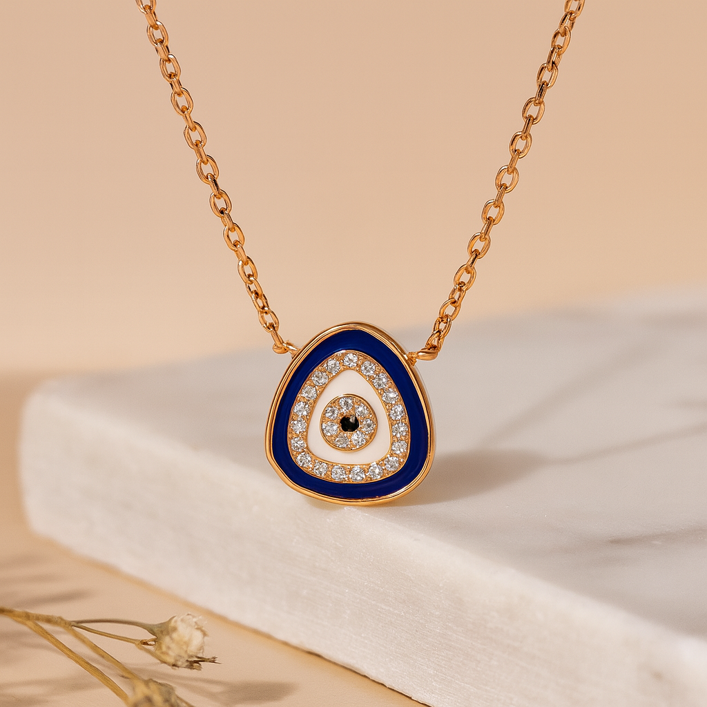 Discover elegance with meaning in the NoirAura Eye Necklace, crafted in rose-gold plated 925 sterling silver. Featuring a bold teardrop evil-eye pendant with deep navy enamel and a sparkling halo of cubic zirconia, this necklace embodies protection, strength, and modern sophistication.