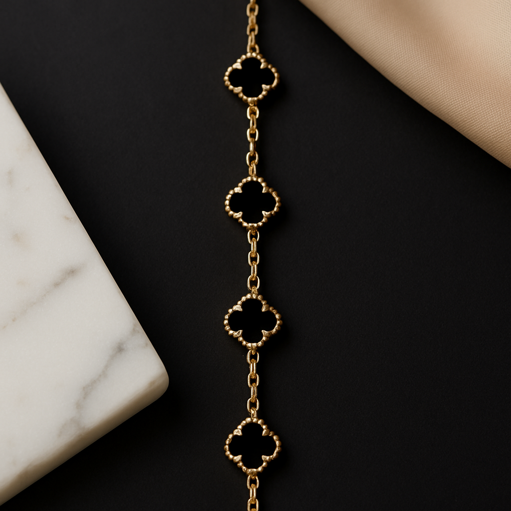 Elevate your style with the OnyxAura Bracelet, a striking blend of elegance and symbolism. Crafted in 925 sterling silver with a radiant gold finish, this bracelet features four black onyx clover charms, representing strength, luck, and timeless beauty.