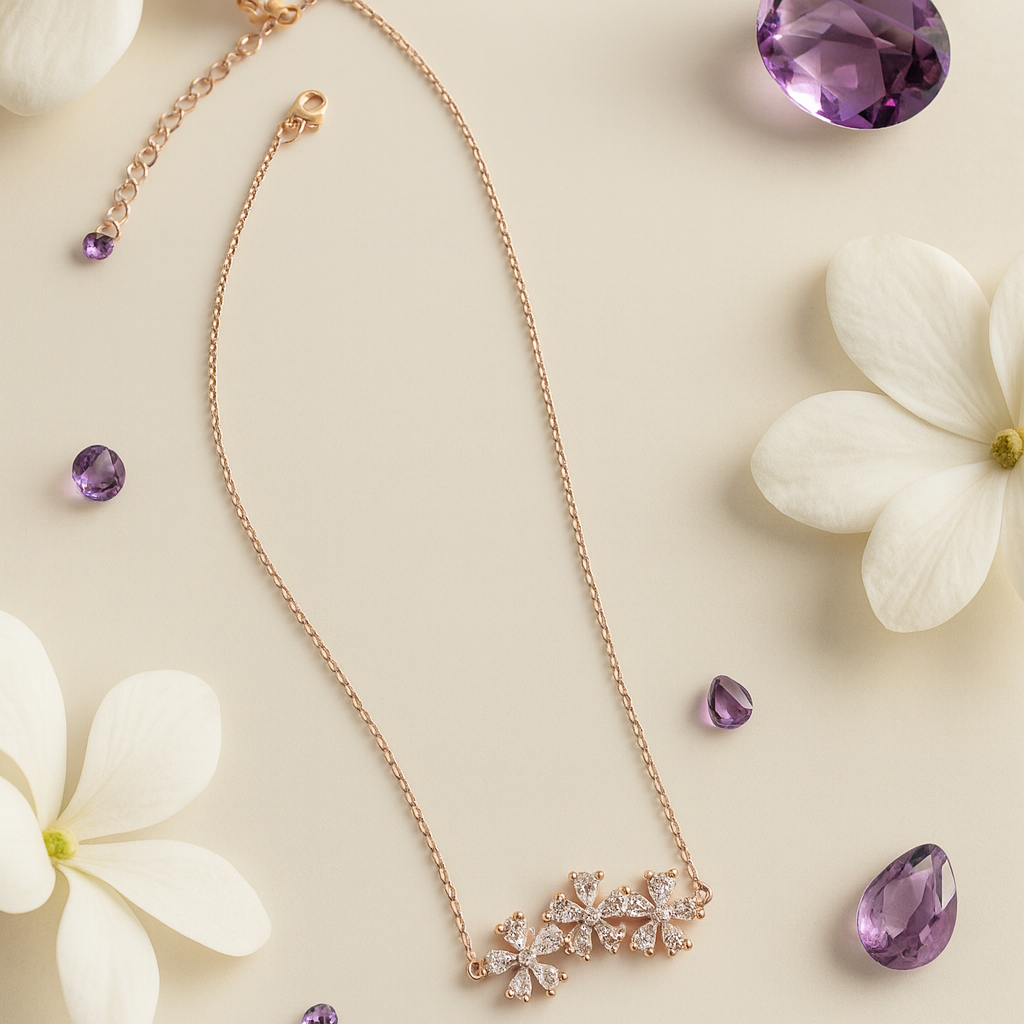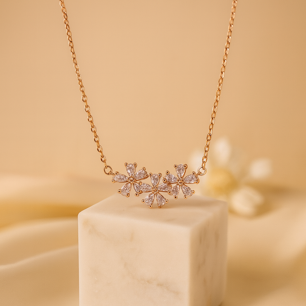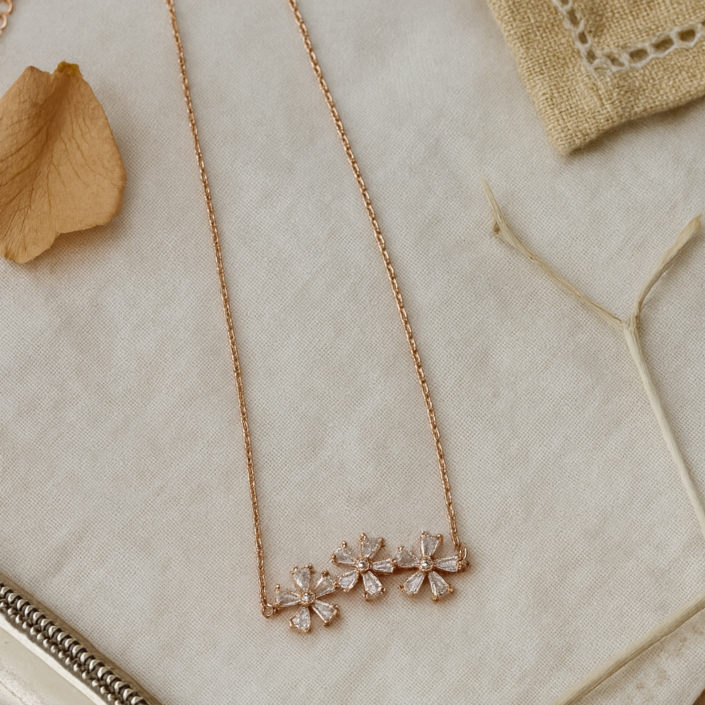 Embrace the beauty of blossoms with the Petalia Grace Necklace, crafted in rose-gold plated 925 sterling silver. Featuring three dainty floral motifs set with sparkling cubic zirconia, this necklace captures the charm of nature with a touch of luxury.