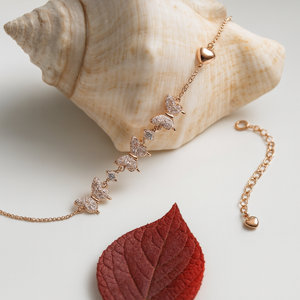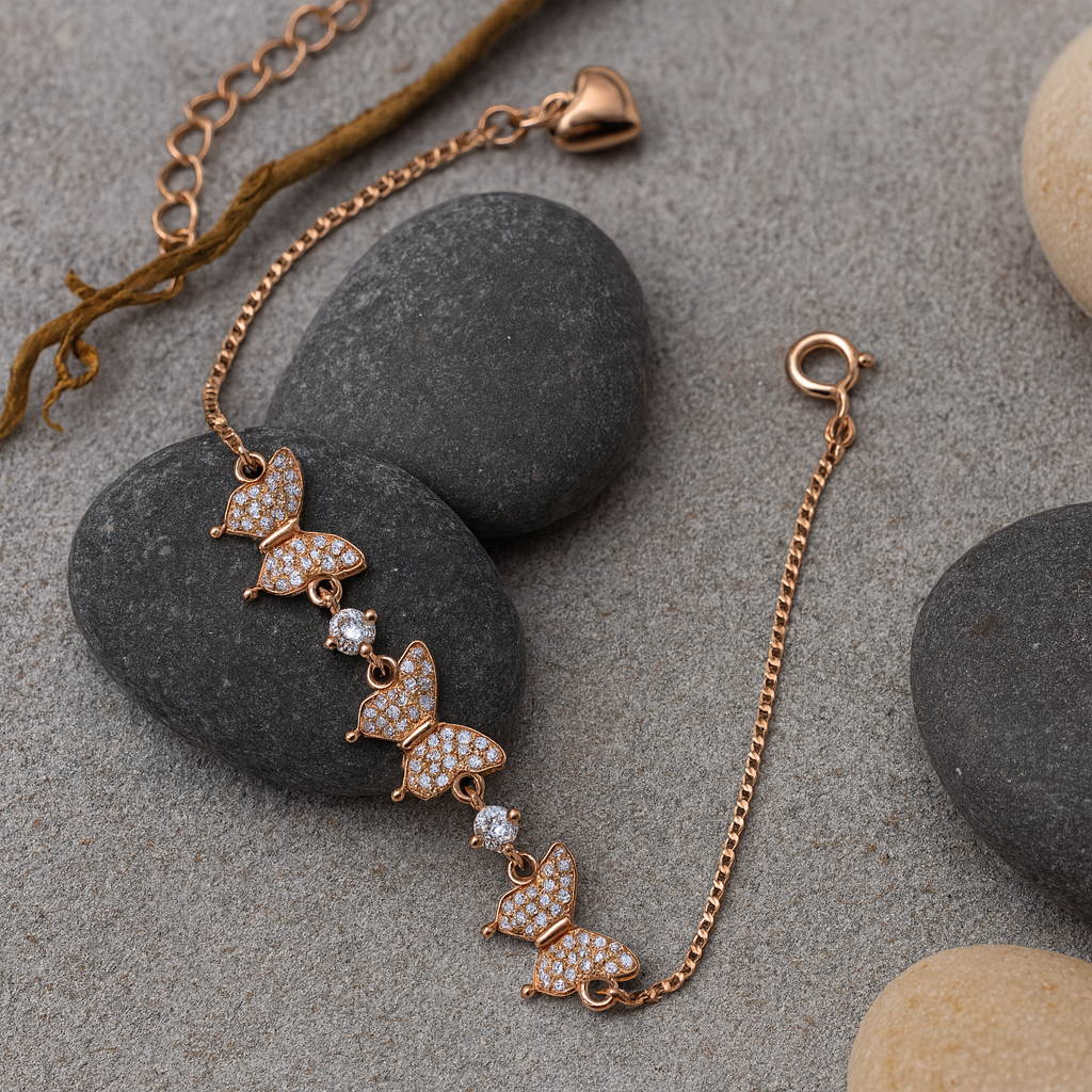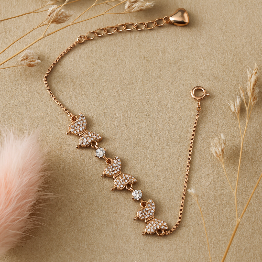 Embrace elegance with the RoséFlutters Bracelet, crafted in fine 925 sterling silver with a luxurious rose-gold finish. Adorned with sparkling butterfly motifs and dazzling cubic zirconia stones, this bracelet beautifully symbolizes freedom and grace.