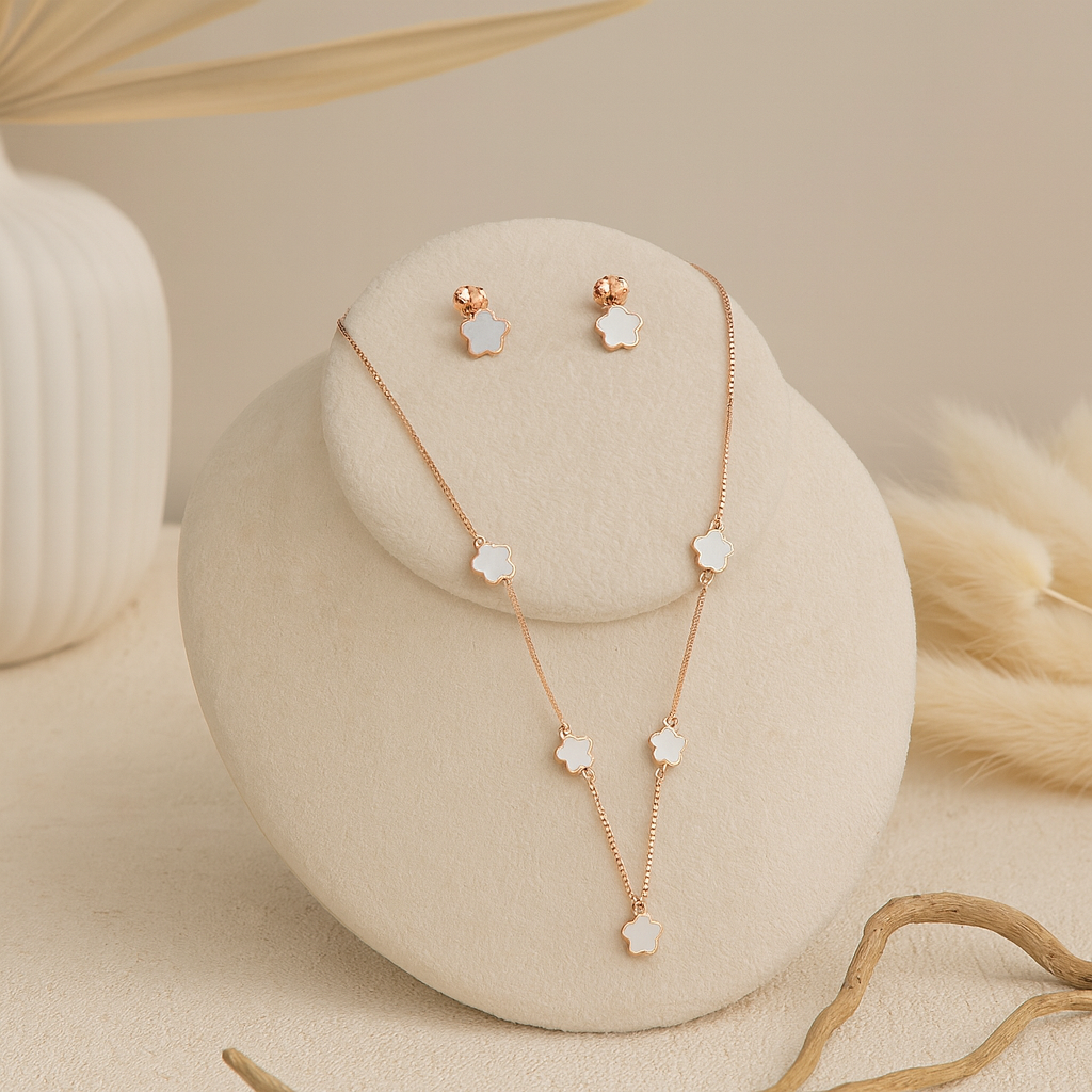 "Introducing the Rosélia Bloom Set – a graceful chain and earring duo crafted in luxurious rose-gold plating, adorned with delicate mother-of-pearl floral charms. This timeless set embodies femininity and elegance, making it the perfect companion for festive celebrations.