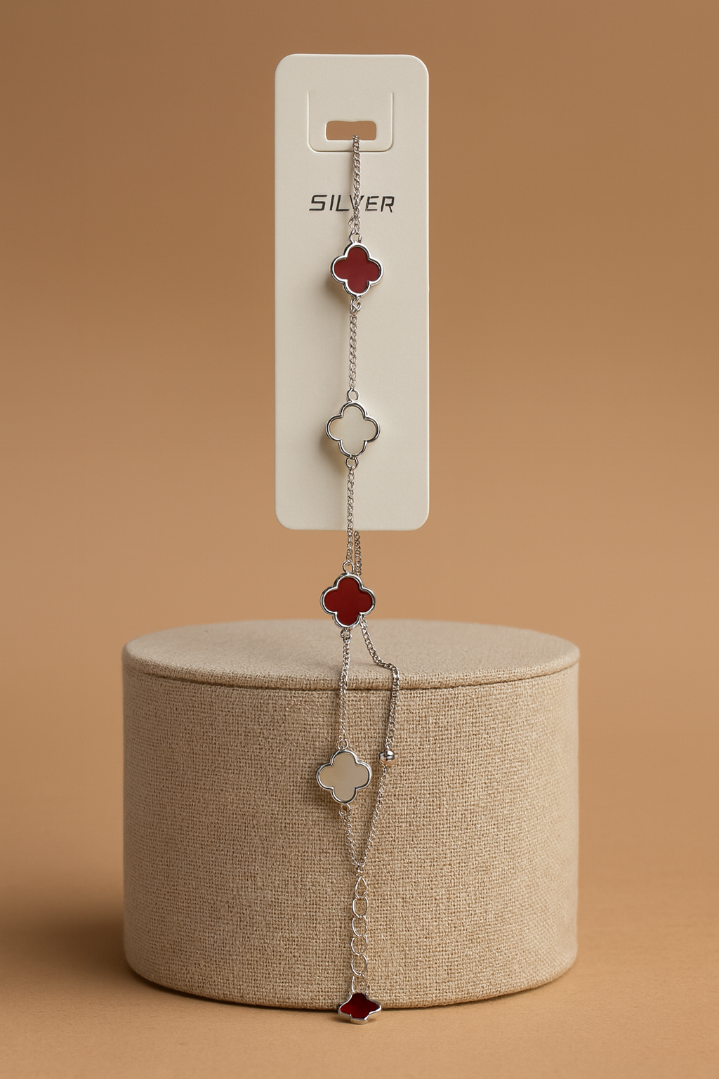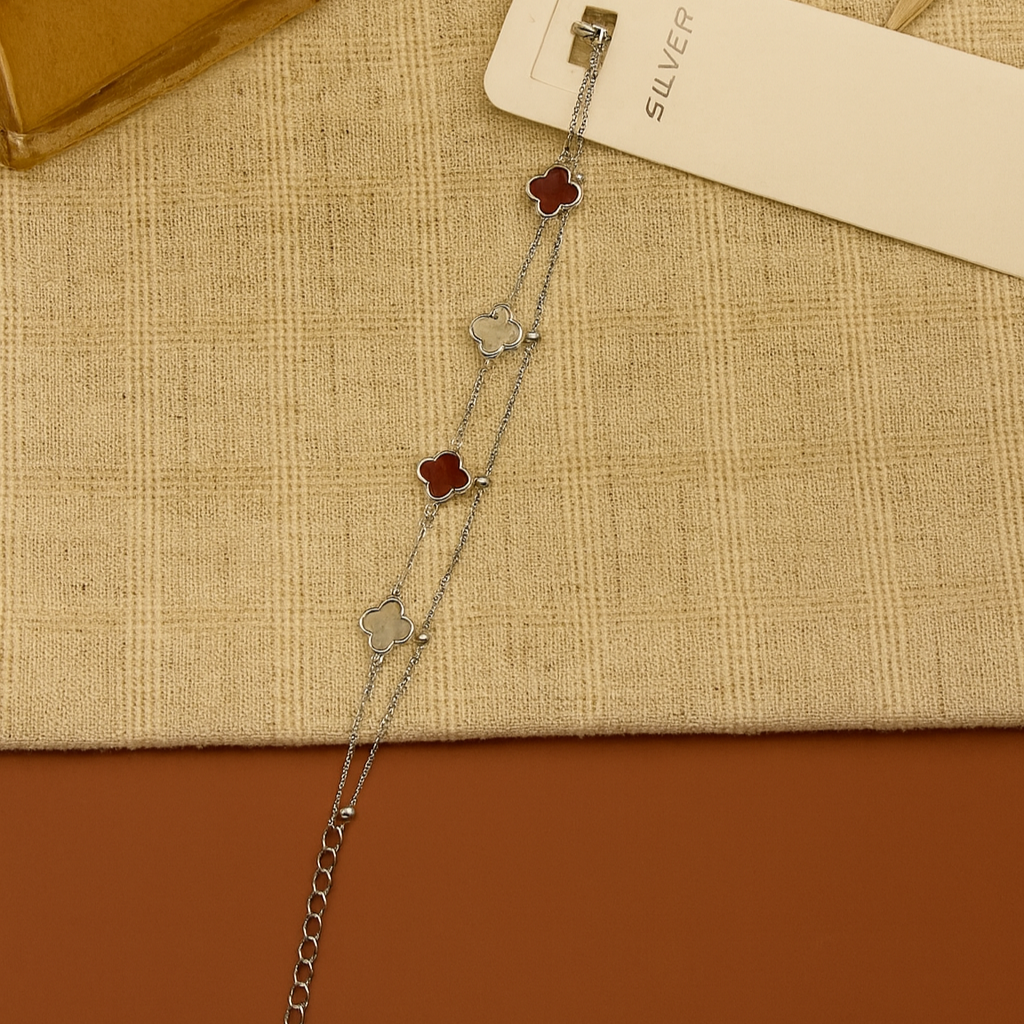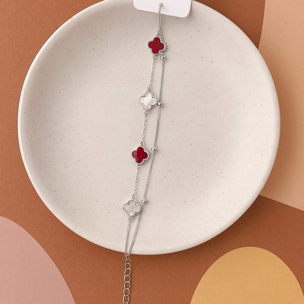 Add a touch of timeless elegance to your style with our ScarletAura Silver Clover Bracelet. Crafted in pure 925 sterling silver, this bracelet features alternating deep red and pearly white clover motifs, symbolizing luck, love, and harmony.