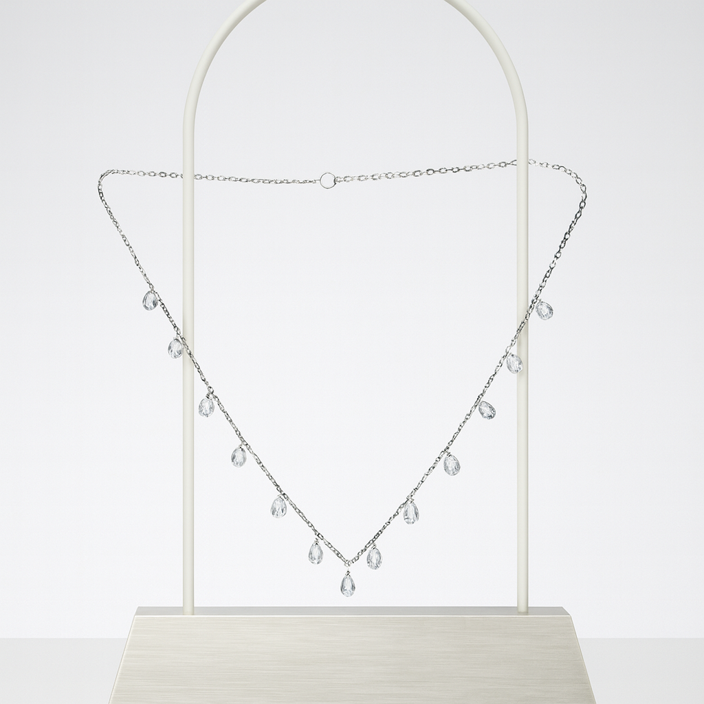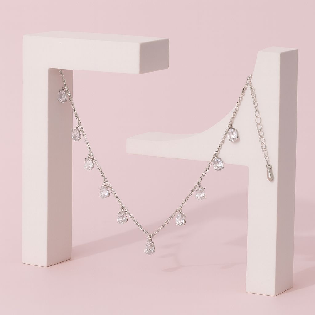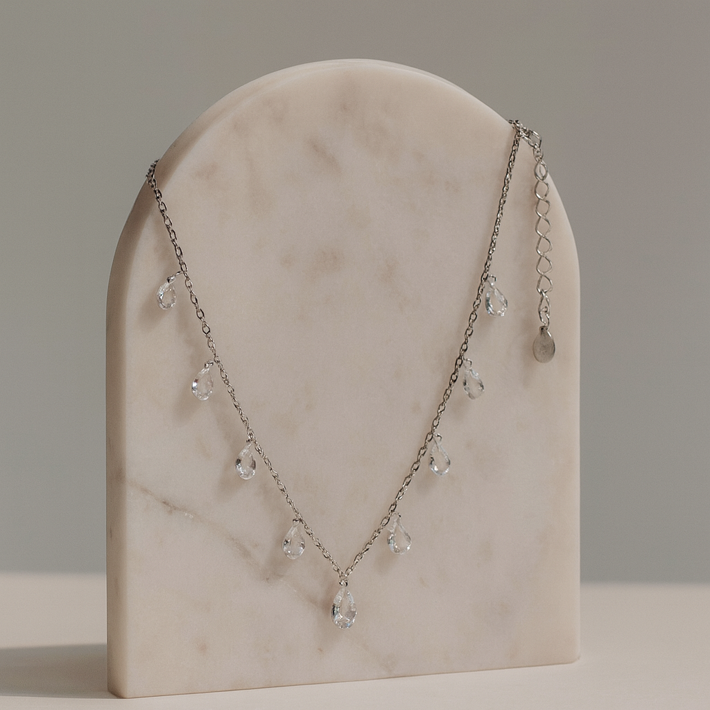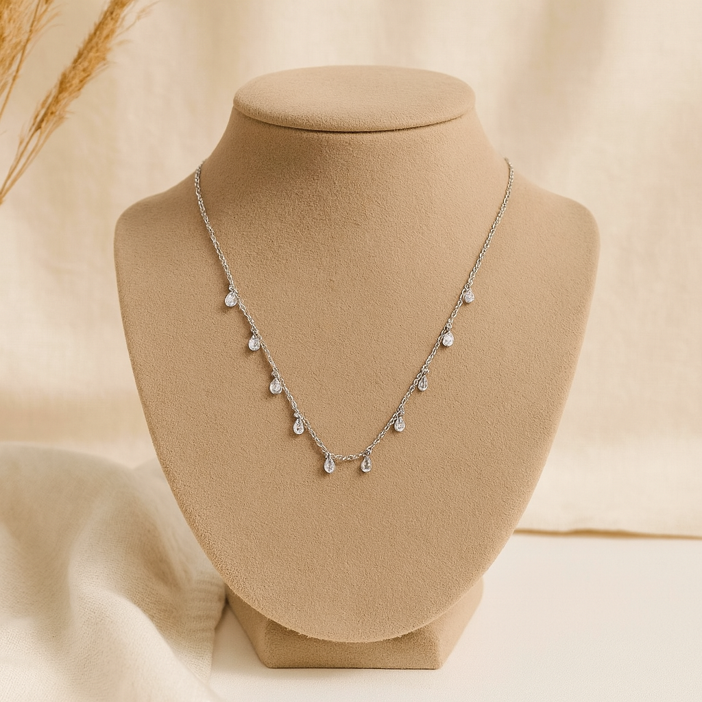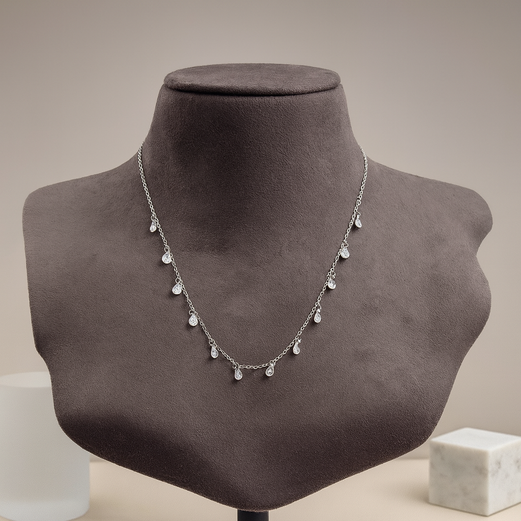 Elevate your elegance with the Seraphic drops Necklace, a graceful creation in 925 sterling silver. Featuring a delicate chain adorned with shimmering teardrop-shaped cubic zirconia charms, this necklace captures the ethereal beauty of falling starlight.