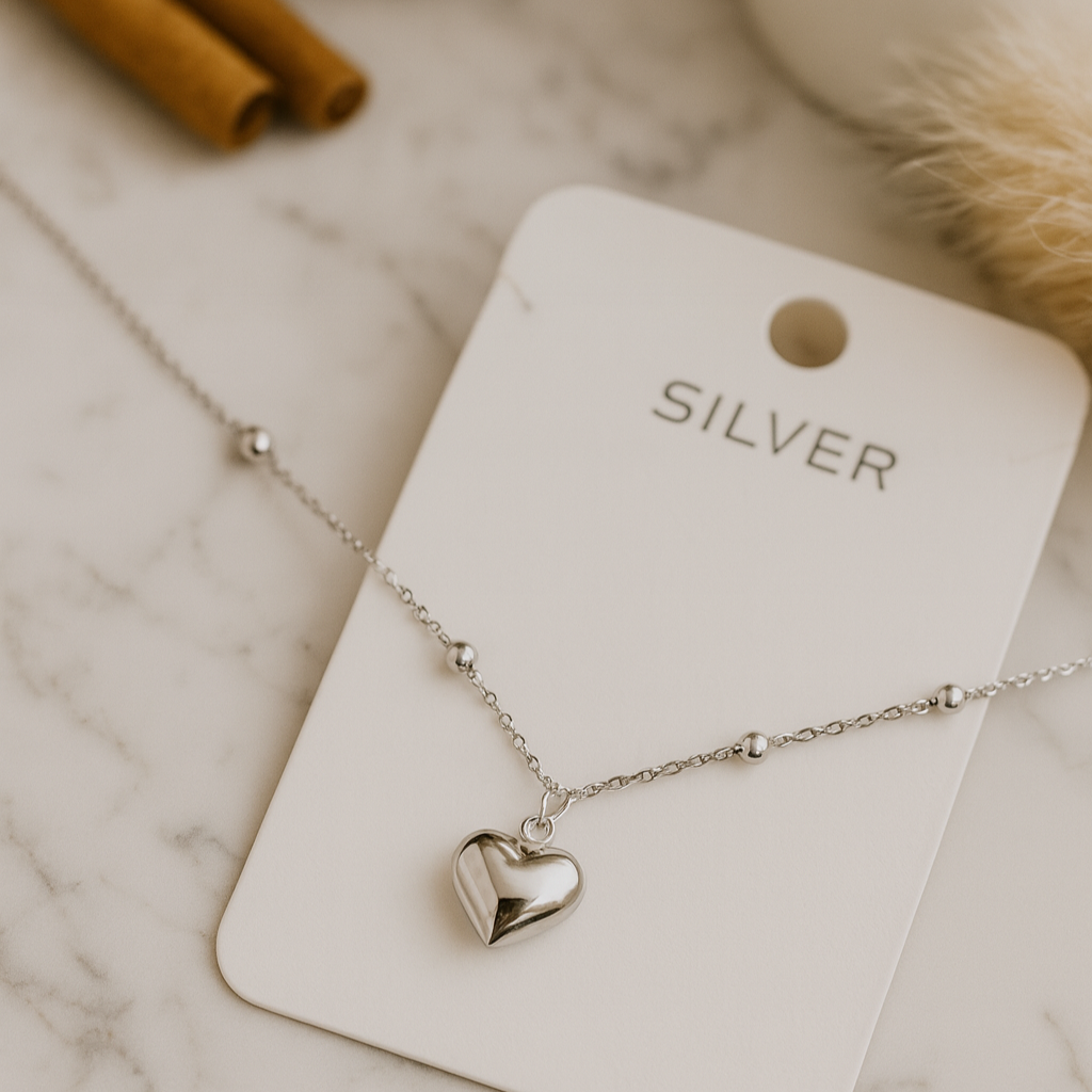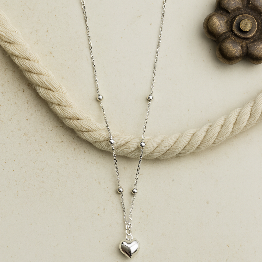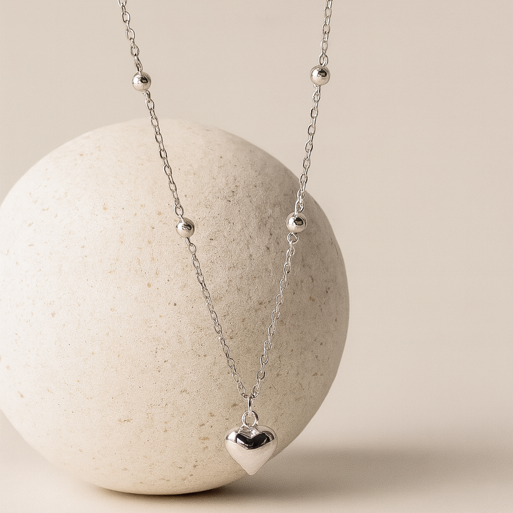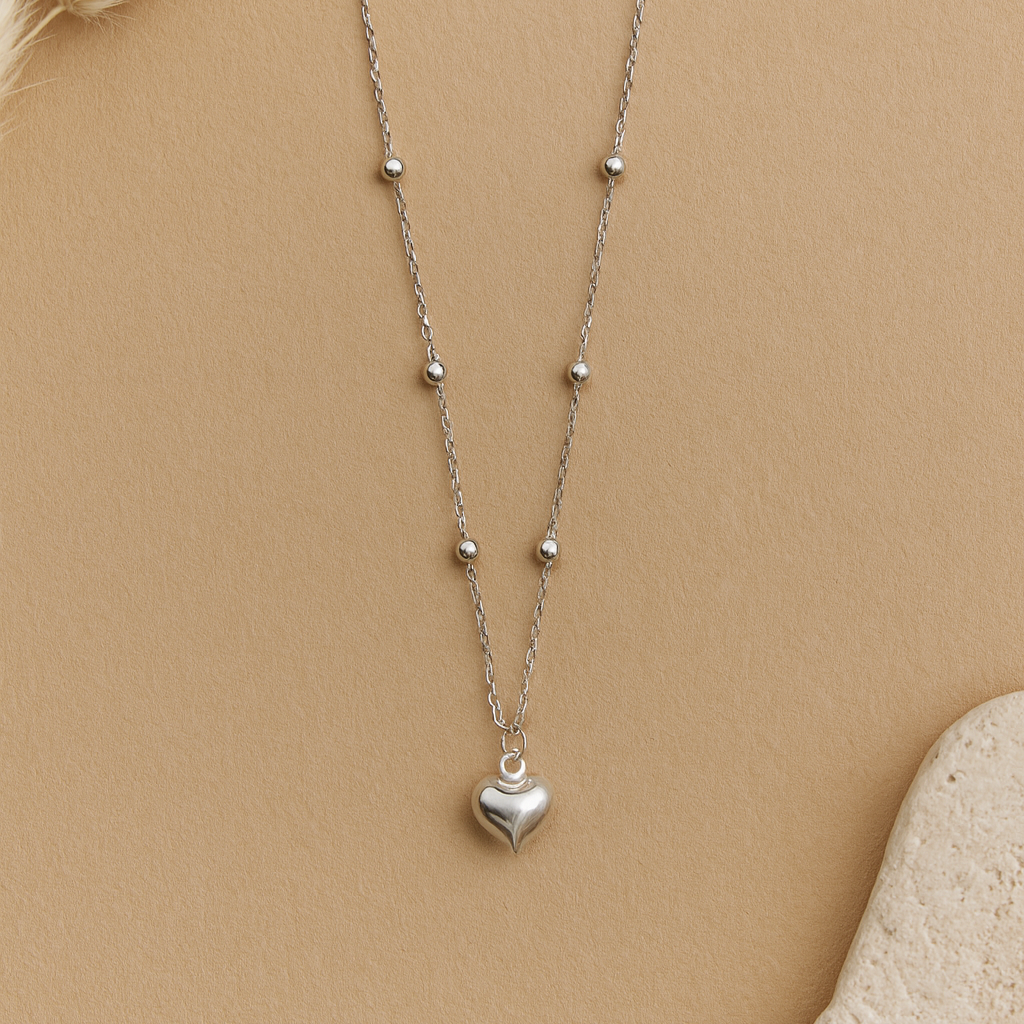 The Serenique Heart Necklace is a delicate symbol of love and serenity, crafted in fine 925 sterling silver. Featuring a polished heart pendant on a dainty beaded chain, this timeless piece radiates elegance and simplicity.