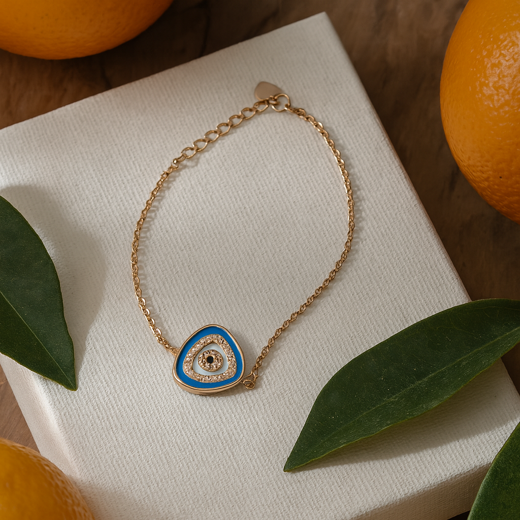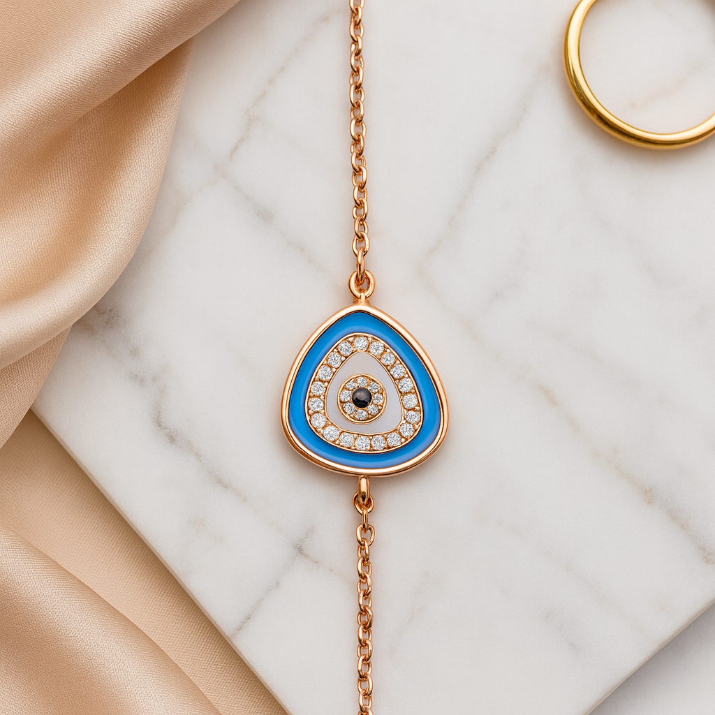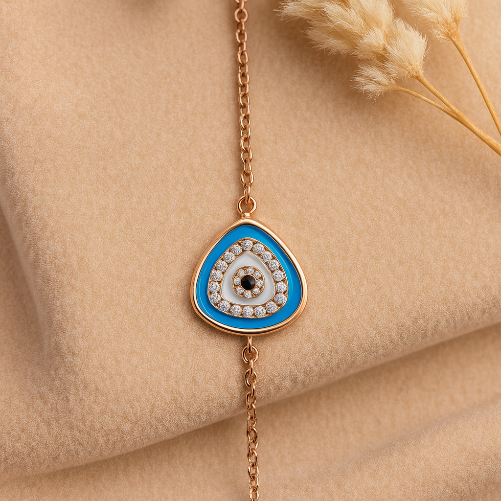 Elevate your style with the TriAura Charm Bracelet, a symbol of elegance and protection. Crafted in fine rose-gold plating over 925 sterling silver, this bracelet features a striking triangular Evil Eye design framed with sparkling cubic zirconia and vibrant enamel.