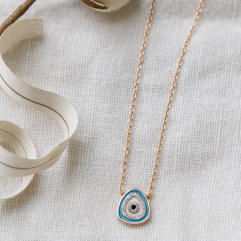 Step into elegance and protection with the Trinity Eye Halo Necklace, a stunning creation in rose-gold plated 925 sterling silver. Featuring a unique teardrop-shaped evil-eye pendant accented with turquoise enamel and surrounded by shimmering cubic zirconia, this necklace radiates both strength and sophistication.