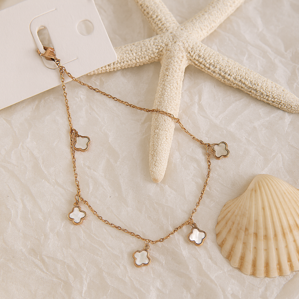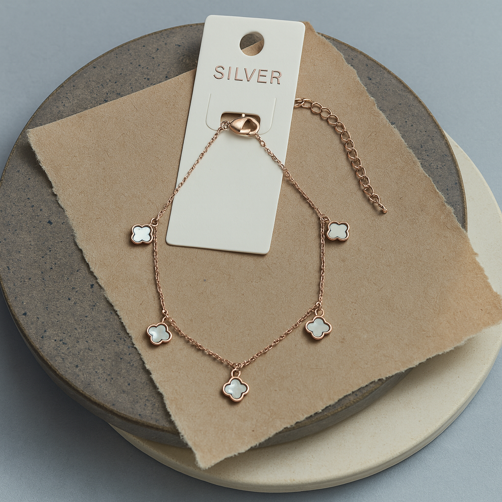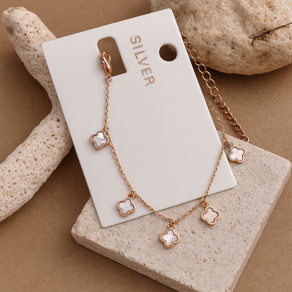 Elevate your everyday style with the VelourLuck Bracelet, a stunning piece crafted in 925 sterling silver with a refined rose-gold finish. Adorned with delicate four-leaf clover charms inlaid with radiant mother-of-pearl.