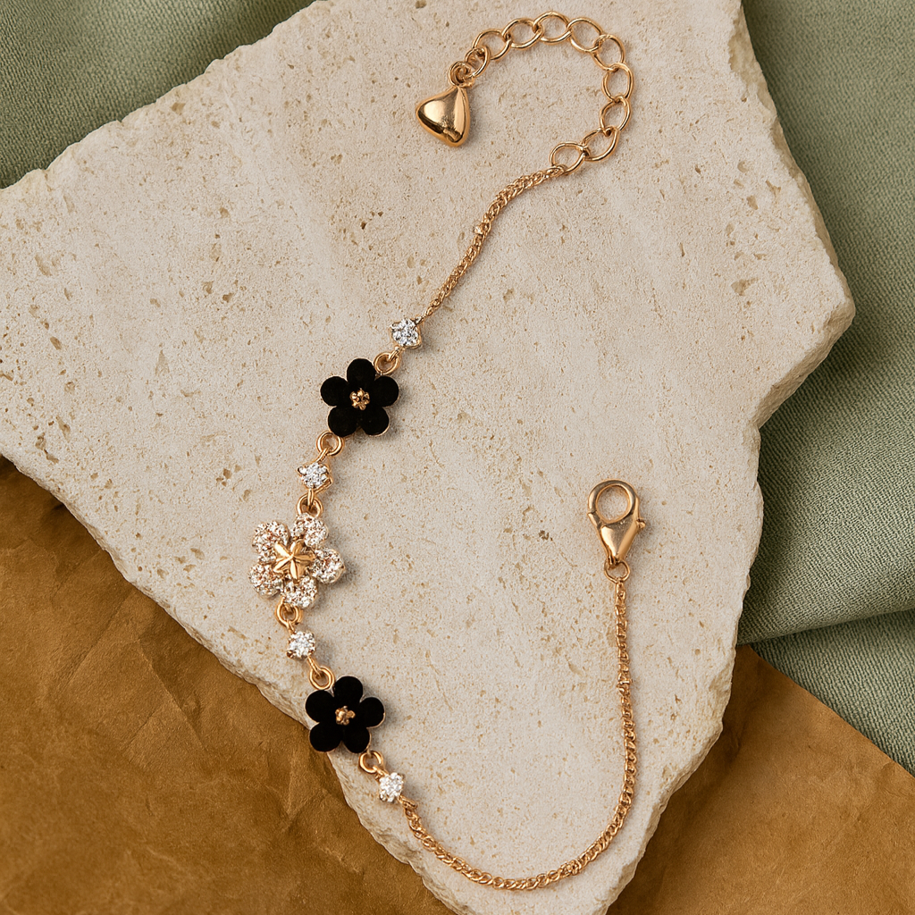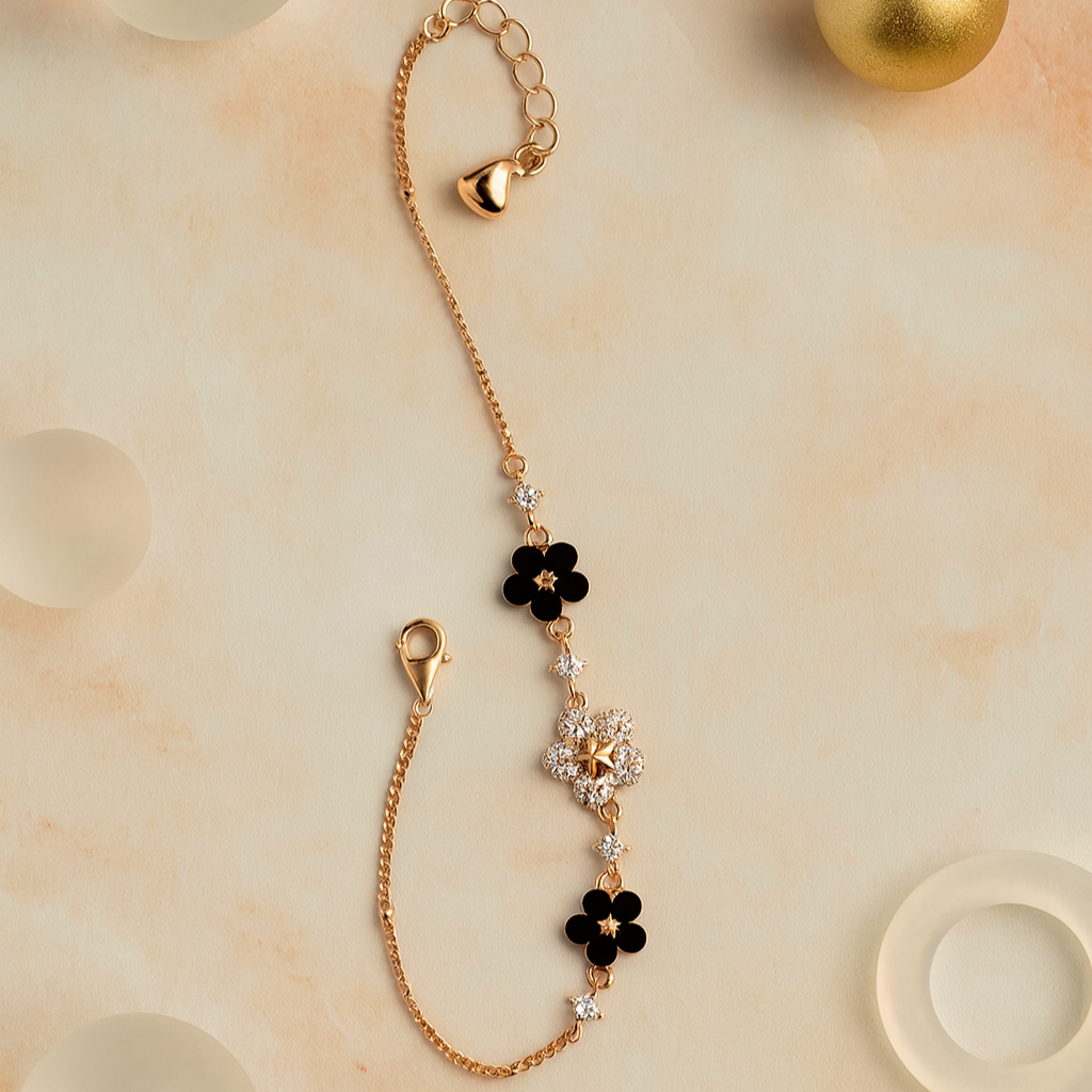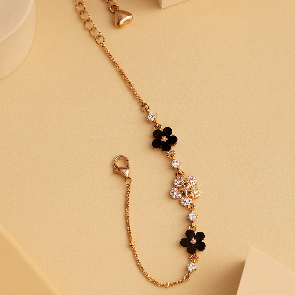 Discover the charm of Veloura, a graceful bracelet crafted in 925 sterling silver with a radiant rose-gold finish. Adorned with glossy black enamel flowers and shimmering cubic zirconia accents, this bracelet is a symbol of elegance and sophistication.
