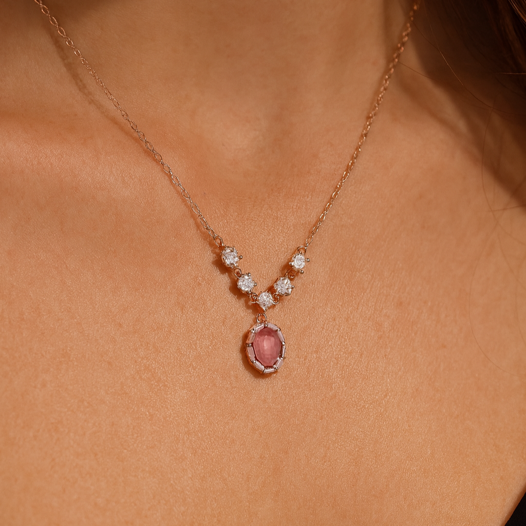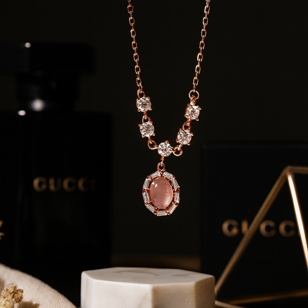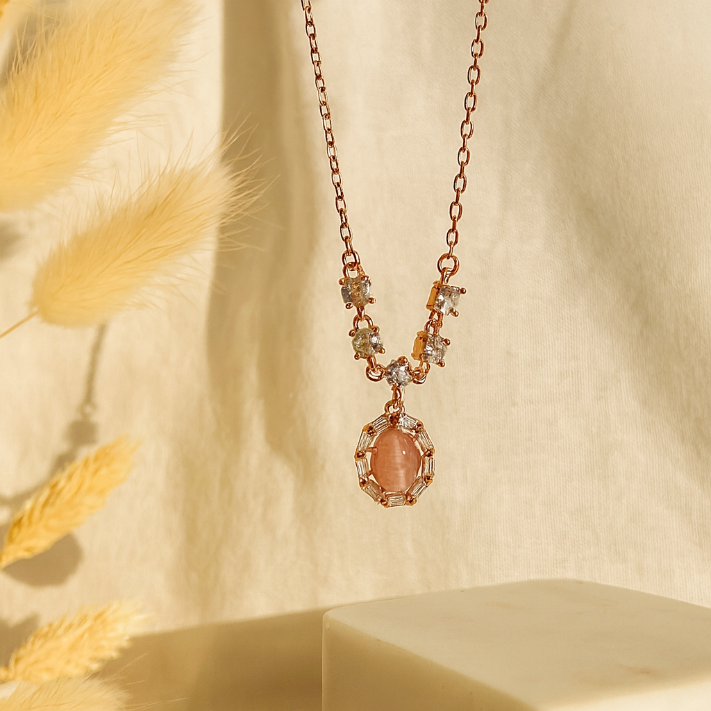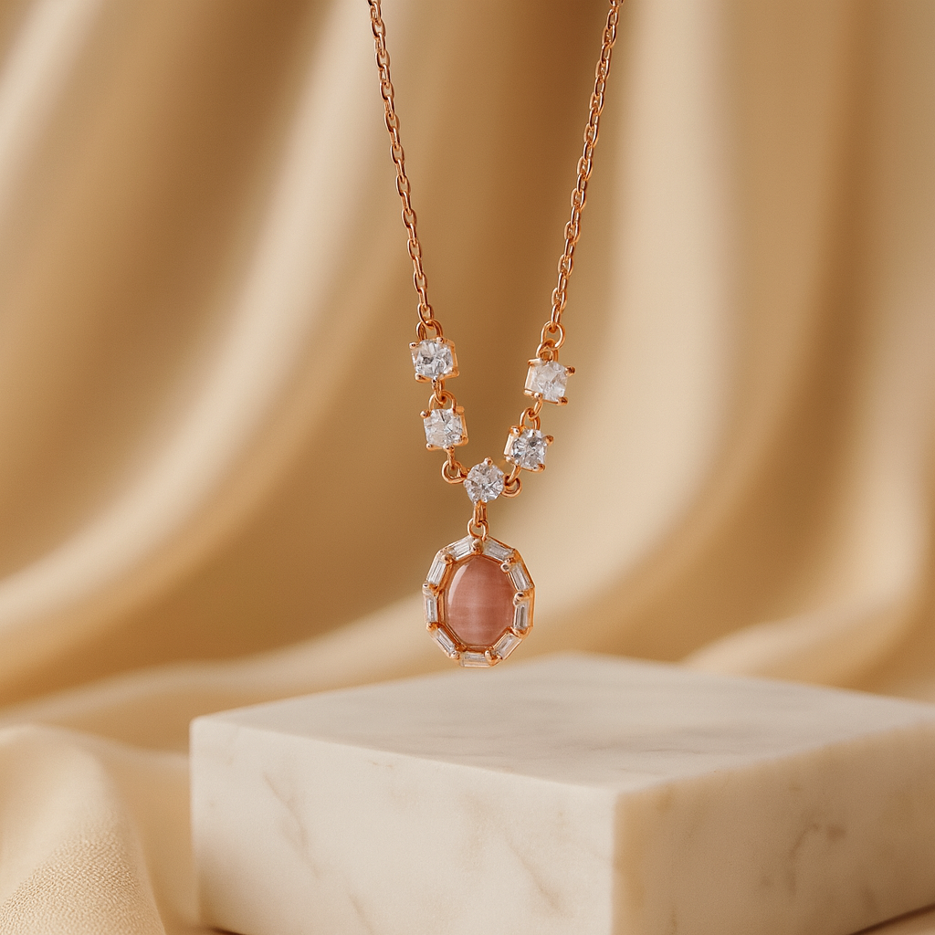 Step into modern elegance with the Zyora Pendant Chain, a masterpiece crafted in fine rose-gold plating. Featuring a radiant oval gemstone encircled by baguette-cut detailing and accented with sparkling cubic zirconia, this design balances timeless luxury with contemporary flair.